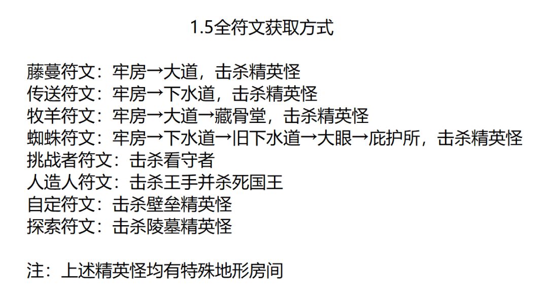 ①藤蔓符文 过图顺序:地牢→有罪者大道(大道右侧第一个藤蔓边)。进入光门,击败不死弓手获取 ②传送符文 过图顺序:地牢→猛毒下水道。(找到被困者,接受任务击败精英怪获取) ③牧羊符文(震地) 过图顺序:地牢→有罪者大道→藏骨堂。(藏骨堂位置在有罪者大道最右边,通过传送石碑开门,进入藏骨堂后击杀精英怪获取,另外,获取此符文需事先获取传送符文) ④蜘蛛符文(爬墙) 过图顺序:地牢→猛毒下水道→旧下水道