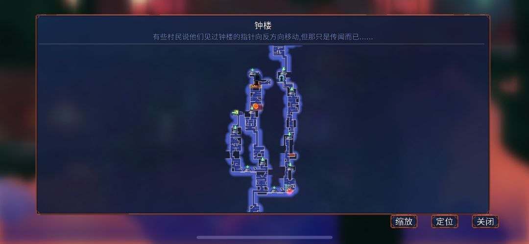 请先看第一张图,这是整张地图的截图,像是一个字“屮”,但是钟的位置呈“山”型排列。只要我们找到4个钟,并按从低到高的音调依次敲响就能拿到钥匙了。 1、最低的钟位于最左的那条路上,地图上需要用钟楼钥匙开启的那扇门旁边有传送,钟就在往下第二个传送的附近。 2、次低的钟位于最右的那条路上,并且在较上的位置,这条路的顶部有两个传送,钟在两个传送之间(黄红之间) 3、次高的钟也在右路,在较下的位置,注意:在