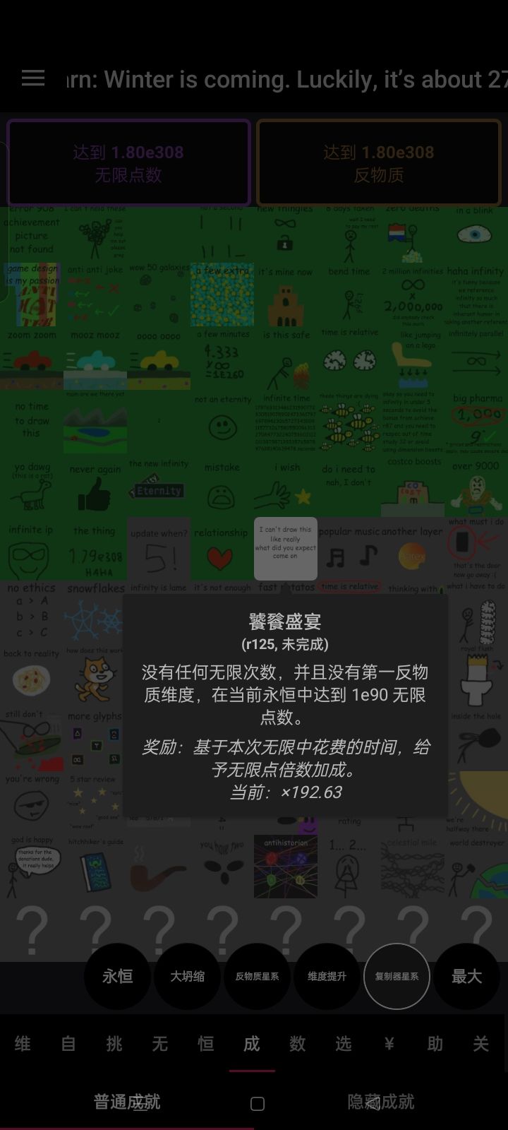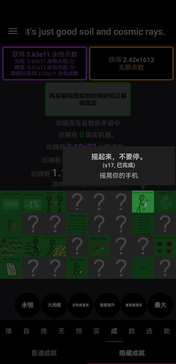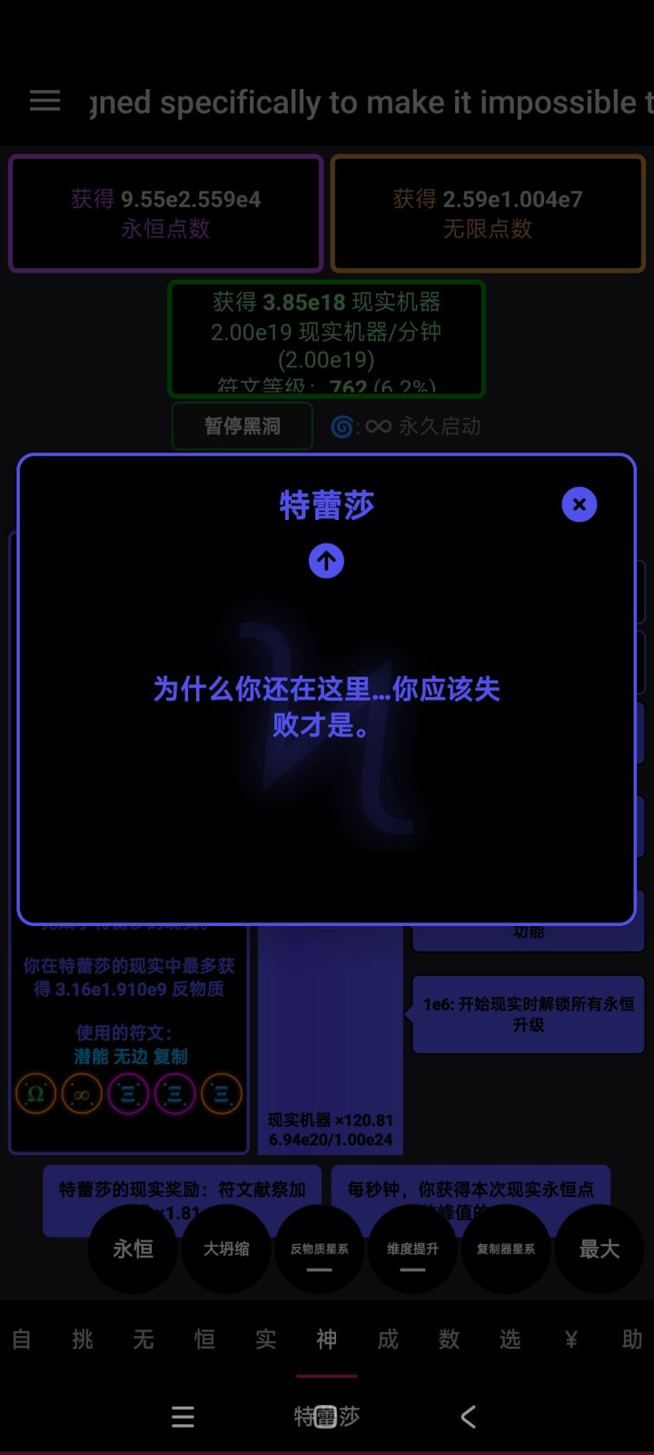 50天通关,手机版只到永恒点数大约1e4000和超光速粒子大约1e9就可以结束了。有卡关的可以问我。
