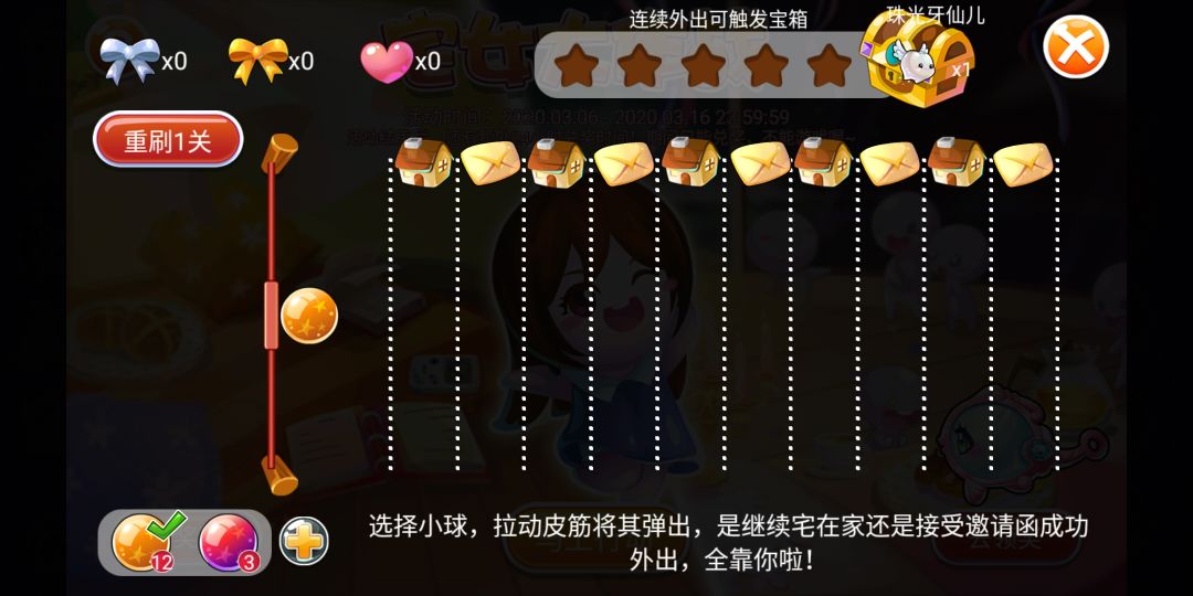 周五看到新活动宅女大作战,攒了三天的免费道具,现在给大家分享下不氪金怎么玩~ 三天12个普通球,3个可以定位的高级球,打开看到右上角宝箱只要球选到五次信封就可以开启一次。 开始玩儿。正好第一次遇到了第二个格子就是信封,用一个普通球先试一下,拉了一点儿,刚好中了第四个格子的信封算是意外收获😂 进了信封有选择妆容步骤,随便选一个,得了金蝴蝶结和海星角,收益海星~ 之后还是按照优先使用普通球,因为信封在