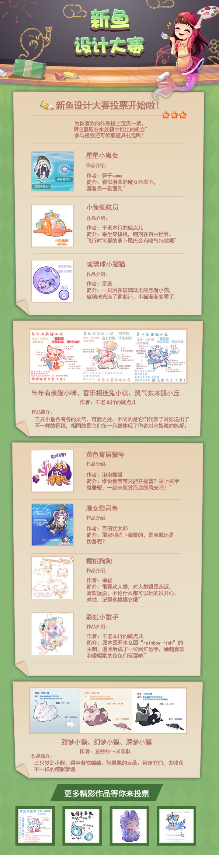 参与方式点击鱼缸左上方的<精彩活动>点击活动页中的<新鱼设计大赛>进入活动,选择右侧投稿入口进行投票,参与即可领取道具礼包~
