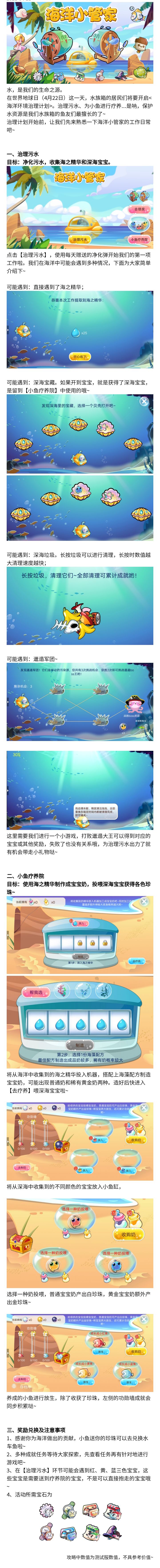 为了宣传保护环境、提倡低碳生活, 每年的4月22日被定义为世界地球日(The World Earth Day)。水族箱中的居民们也十分重视这个节日:治理污水、为受到污染的小鱼进行疗养。这些环保行为希望被大家看到并将【环保】重视起来。象征着生机与环保的欢乐小水车将要带领大家开启这次环保之旅。4月22日,我们在【海洋小管家】中不见不散~