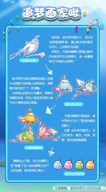 一名热爱画画的鱼友,投稿设计的鱼儿即将在游戏中推出啦!能把自己的梦想投入到喜欢的事情中,想想都非常激动辽~٩(๑>◡<๑)۶呐 祝福各位鱼友的梦想都能早日实现!