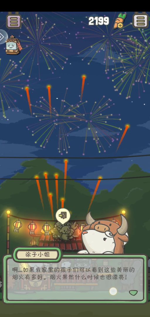 发现沫沫到哪都要抱着树桩肯恩的衣服竟然变成红色的!(难道犀牛也过本命年?!全小镇的npc都来看烟花了,好热闹,第一次人这么齐制作组有心了