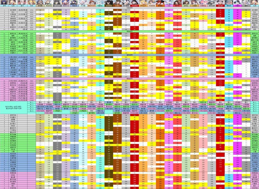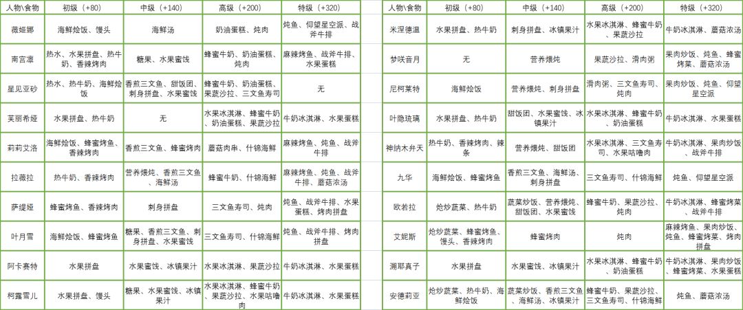 wiki上有测试时的赠礼数据,但是本人看不懂,所以自己做了一个(本人没有的人偶用灰色填充) 祝各位的老婆尽早满好感度 8/27本人对数据进行了一点点简化,仅留下了对应角色喜欢的食物,增加了萨缇娅、阿卡赛特、叶隐琉璃、九华的初级食物数据。8/28 补充了部分遗漏数据,补充了部分非喜好但好感增长较多的食物,增加了拉薇拉、尼柯莱特的初级赠礼数据。 8/29 补充了萨缇娅、阿卡赛特、叶隐琉璃、九华、拉薇拉