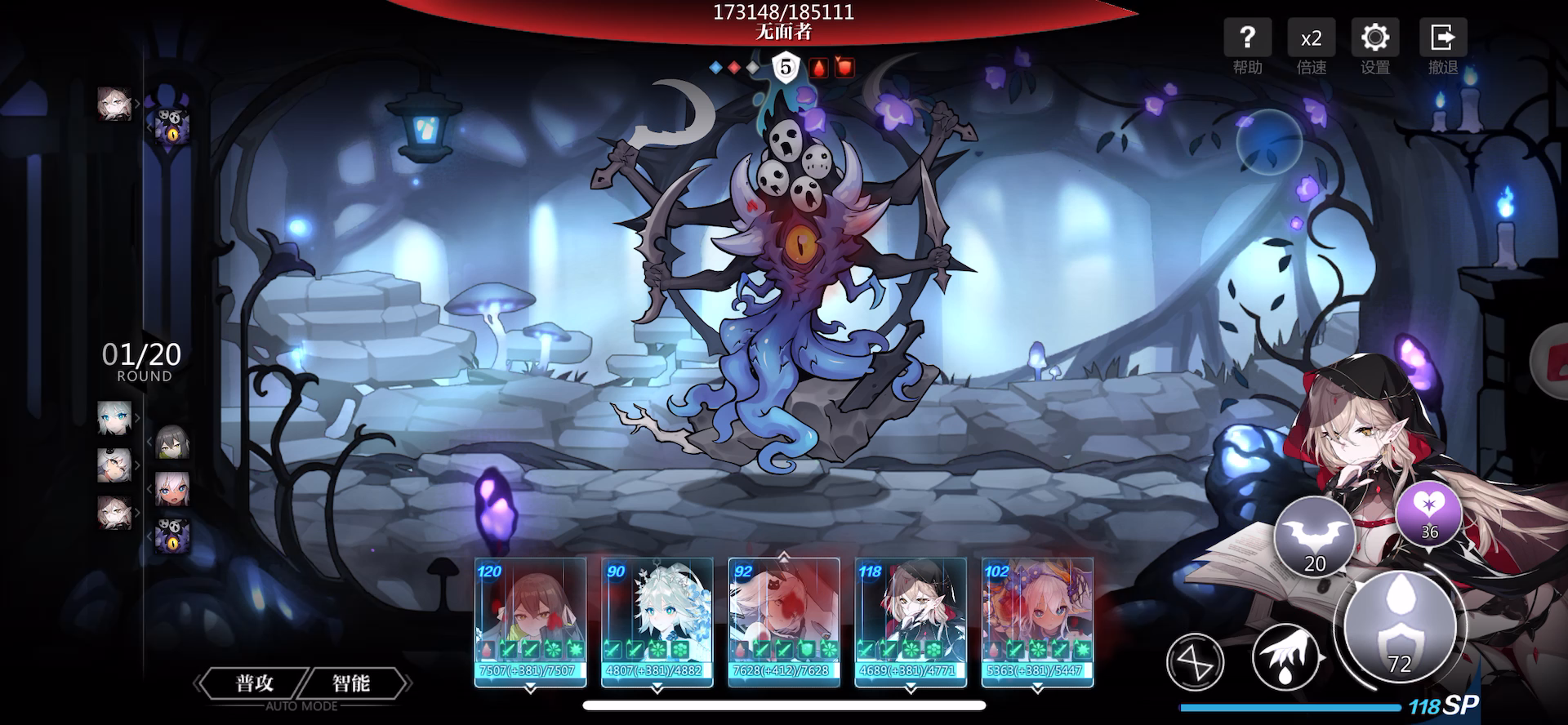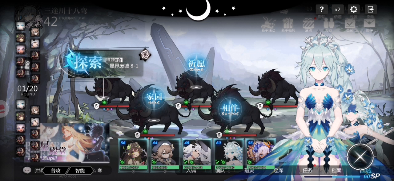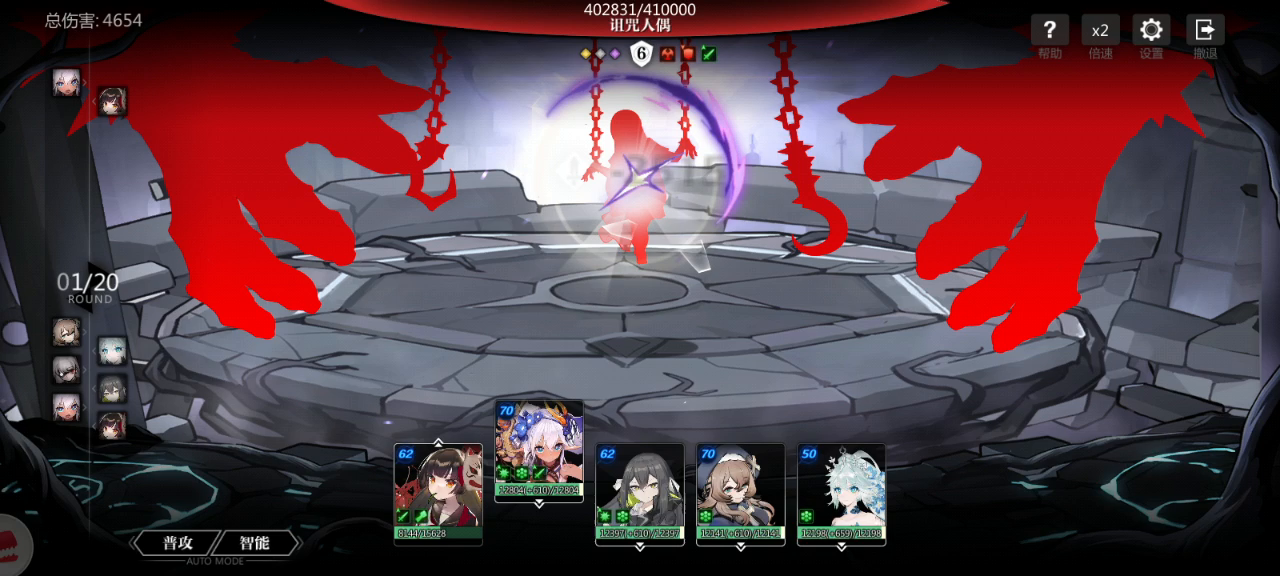 一开始想玩莉莉感电,后来发现伤害好低,才发现非魔法伤害-100%。。。 又发现对面都是横排,并且都有魔弱,那么配队就出来了。 ——横排魔队 主C:越一弥心(全魔系技能) 副C:吸血鬼(全魔系技能) 奶:王女(全魔系技能) 工具人:薇妈(2212) 前排:恶魔(1211) 基本上吸血鬼开完大招之后,弥心带着王女的大继续输出。所有关卡的基本套路都这个。 就是有一个缺点,弥心速度太快。。。没有速度卡的话