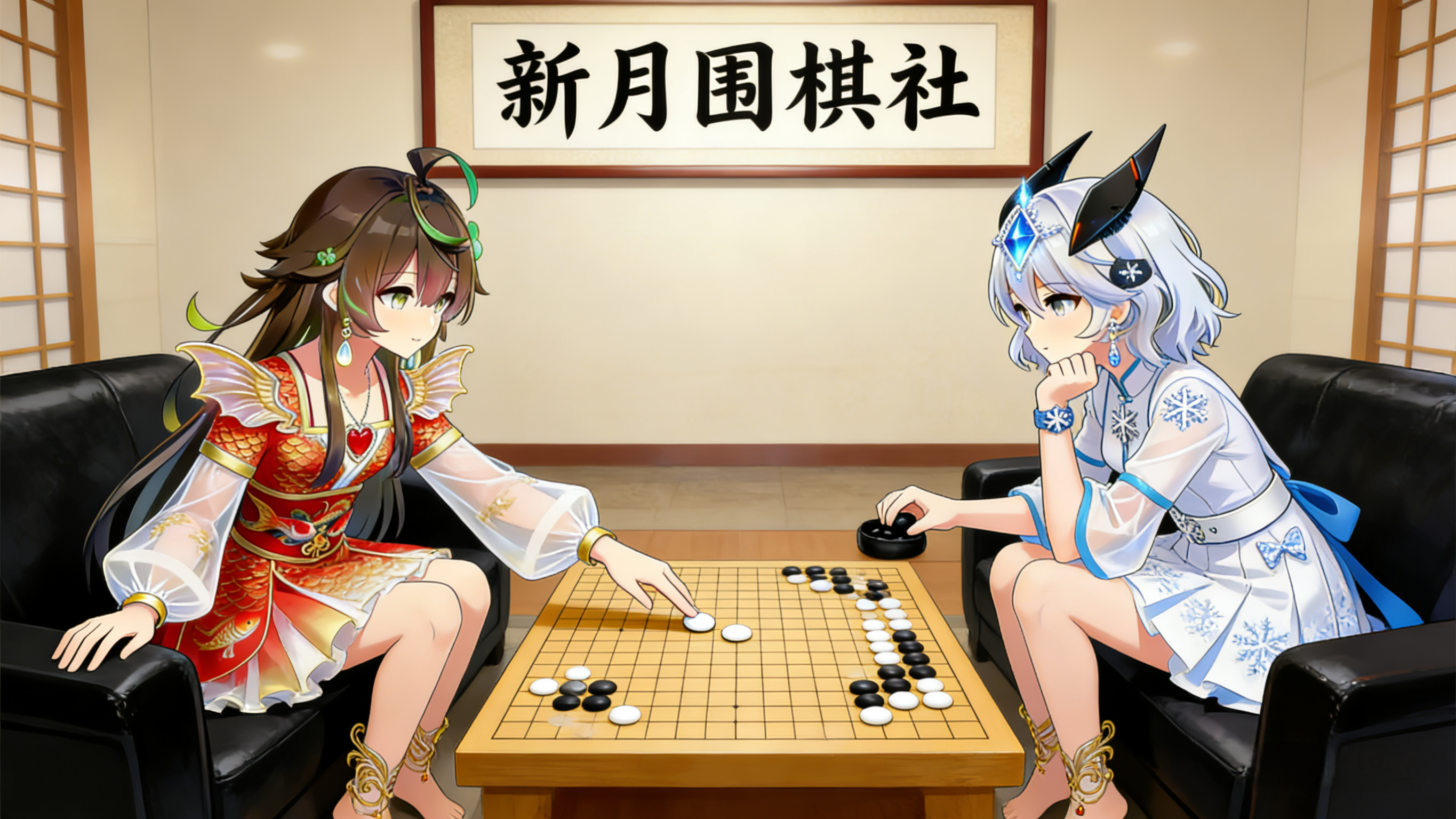 红袂裁霞,素衣凝雪,堂中对弈决雌雄。指尖星落,枰上云生,黑白纵横藏丘壑。新月为盟,棋道作契,一着定局见神通。