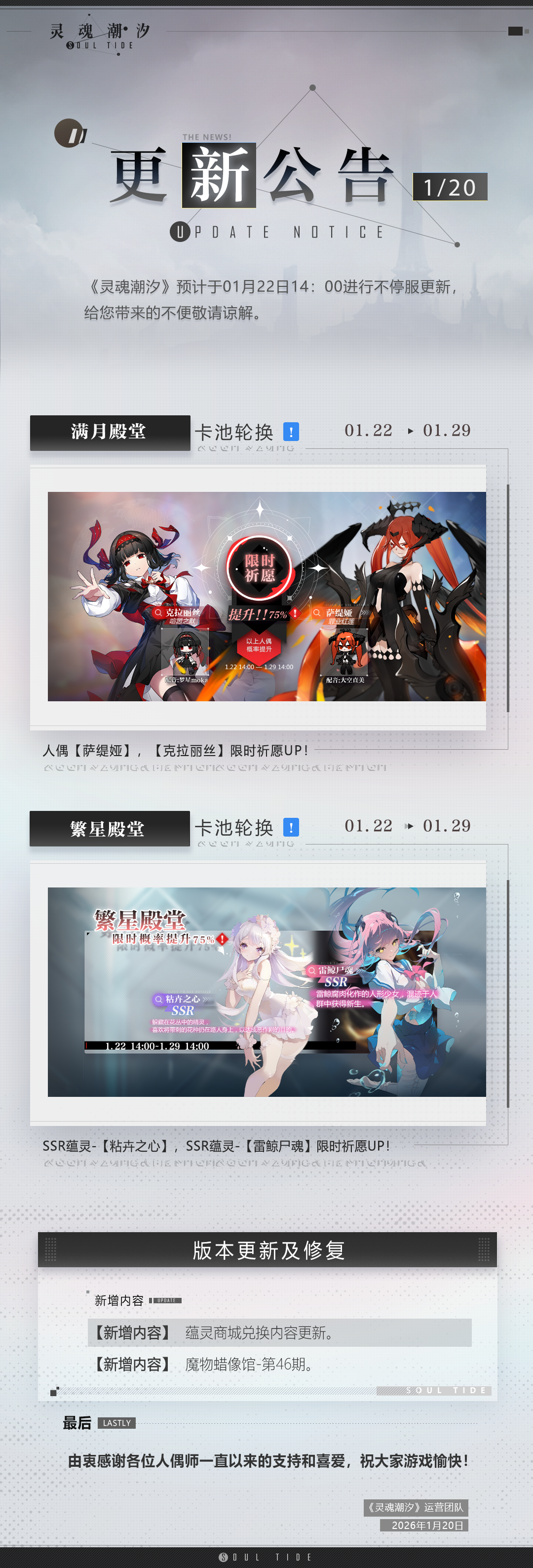 《灵魂潮汐》预计于1月22日14:00进行不停机更新,给您带来的不便敬请谅解。