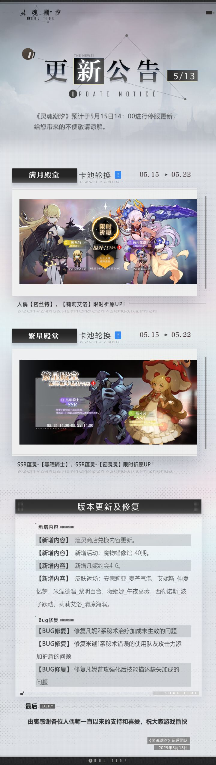 《灵魂潮汐》5月22日不停机维护公告《灵魂潮汐》预计于5月22日14:00进行不停机更新,给您带来的不便敬请谅解。