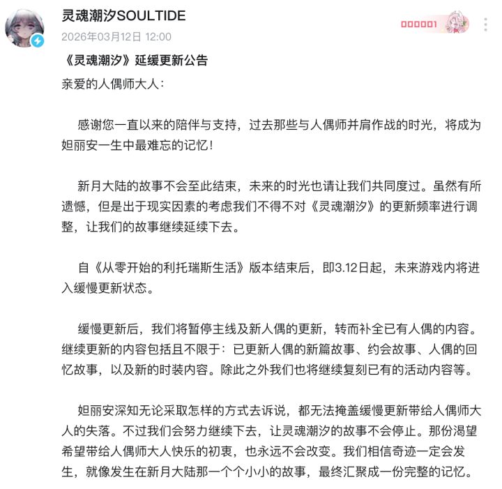 鬼脸科技《灵魂潮汐》正式发布延缓更新公告,游戏进入长期缓慢更新状态。官方宣布,即日起暂停主线剧情推进与全新人偶上线,后续仅维护现有内容,补全已有人偶相关剧情与玩法。消息发布后,玩家间关服猜测不断,知情人士对此作出澄清。此次缓更并非游戏停运,与此前团队全力开发《神隐之子》的情况一致,属于开发重心转移导致的产能收缩。当前主力研发资源已全面倾斜至《灵魂潮汐2》,一代项目保留基础运营团队,维持日常