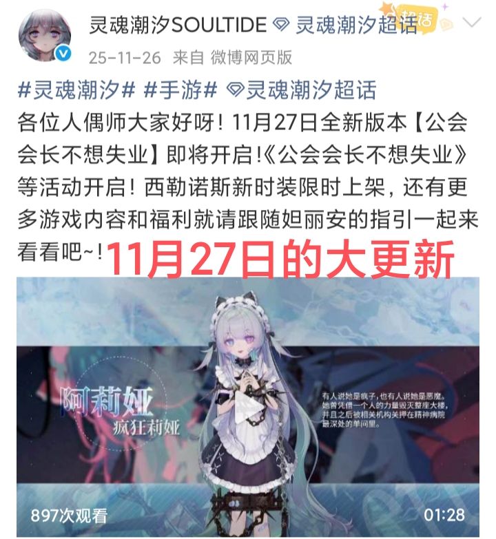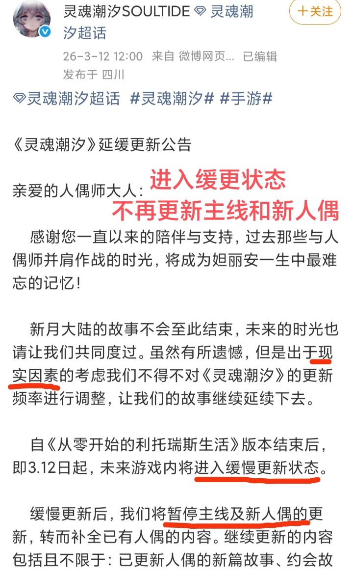 3月12号,《灵魂潮汐》发布公告,宣布即日起游戏进入缓慢更新状态❗❗❗官方给出的理由是,出于现实因素的考虑,游戏将调整更新频率进入缓更状态。这意味着,游戏主线及新人偶的更新将完全暂停。值得一提的是,这是继去年5月《灵魂潮汐》开发商成都鬼脸科技申请破产审查后的首次明确进入缓慢更新状态!而在此之前,游戏团队基本上维持着一个月左右一次大更新的频率!比如最近的一次大更新是2月10号,再上一次是12月