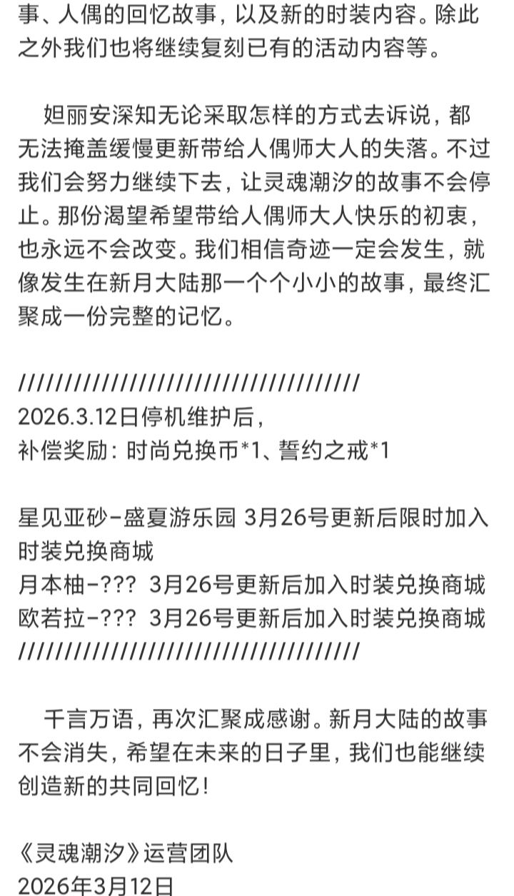 亲爱的人偶师大人: 感谢您一直以来的陪伴与支持,过去那些与人偶师并肩作战的时光,将成为妲丽安一生中最难忘的记忆! 新月大陆的故事不会至此结束,未来的时光也请让我们共同度过。虽然有所遗憾,但是出于现实因素的考虑我们不得不对《灵魂潮汐》的更新频率进行调整,让我们的故事继续延续下去。 自《从零开始的利托瑞斯生活》版本结束后,即3.12日起,未来游戏内将进入缓慢更新状态。 缓慢更新后,我们将暂停主