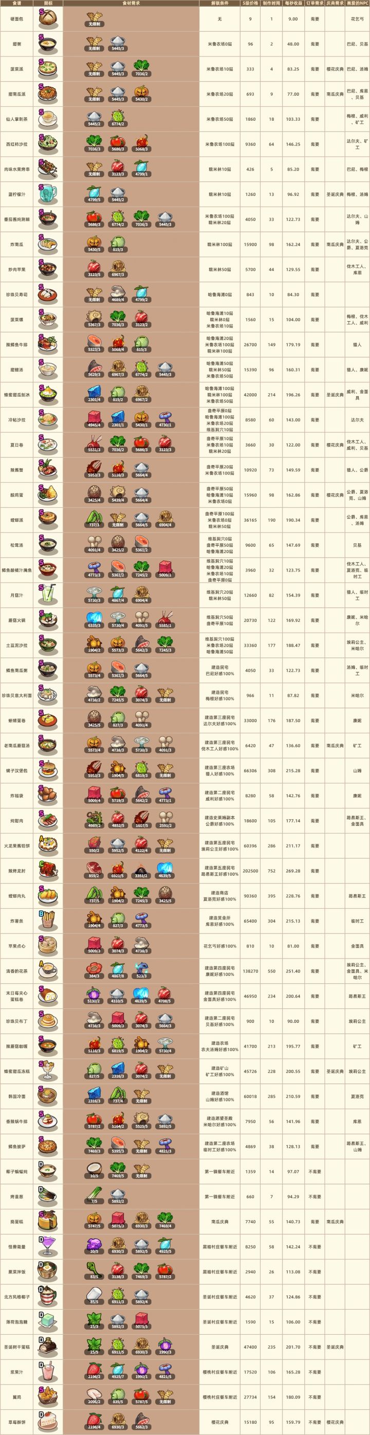 刚开始推荐做蔬菜派这个价格稍微过得去材料容易获取挂机点: 米鲁0,米鲁10推图到糯米换蓝柠檬汁挂机点: 糯米10,米鲁0哈鲁海滩不用理会,跳过直接去曲奇平原,做夏日卷挂机点: 曲奇10,米鲁10,糯米20,糯米0最后队伍开始有些战斗力就去维基洞穴,做蘑菇火锅挂机点: 维基50,维基20,维基0,曲奇10前期队伍先开满八只队槽刷材料快,队伍等级控制在20-30级,厨师也优先强化上去,后面队