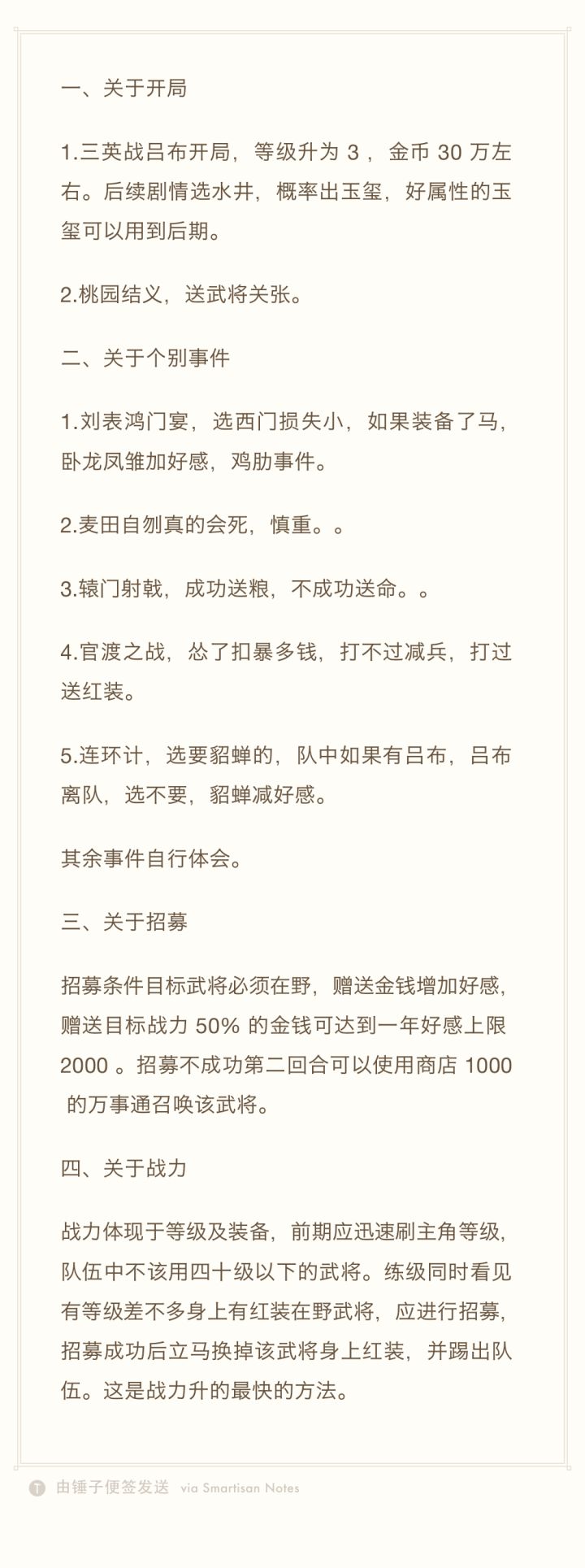 友情提示:该玩家就是曾经0起步统一三国的原理篇一~五是关于武将,六、七是关于攻城,嫌长或者看不懂的话,下一页是懒人篇(萌新篇),短短几行字……一、核心:1.高战物理系武将(用于推图)2.高政治武将(用于登庸)二、武将来源: 1.送钱登庸2.派自己的下属去登庸(高政治且相性与目标武将相近)。以下将自己下属称为A,目标武将称为B)3.钻石商店买三、关于登庸成功率的解释.及相关属性说