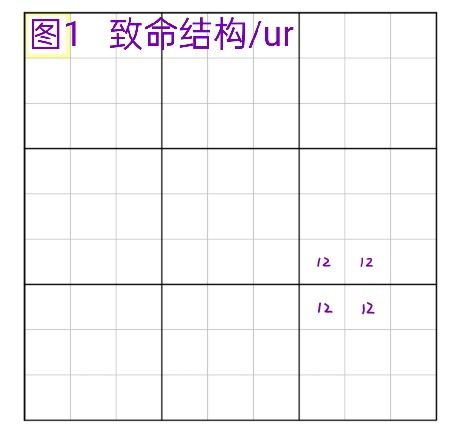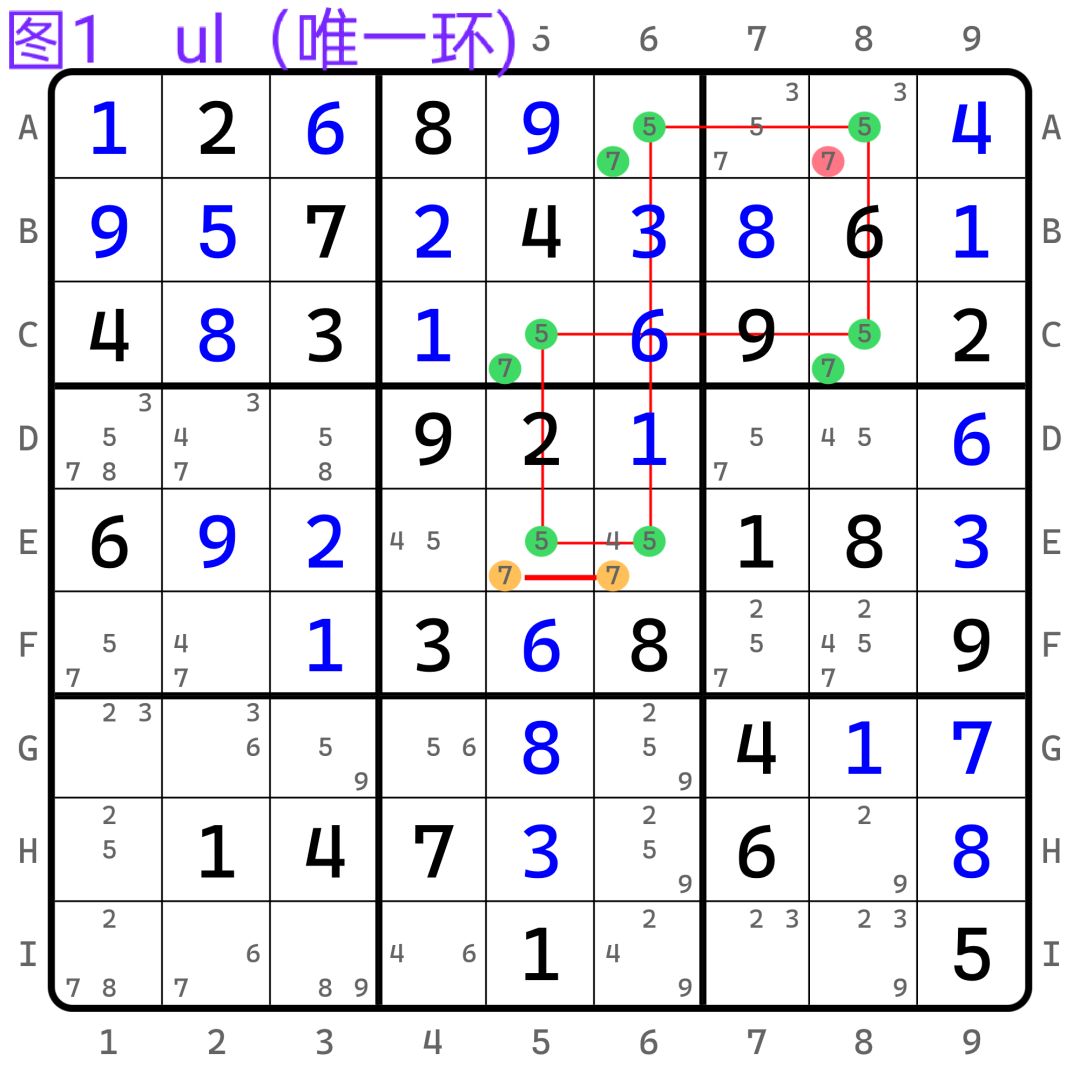 本篇章介绍因致命结构反推删数的几个结构比较大的技巧。 ul(唯一环)结构本身只涉及到ab两个数字,从结构上来看,它很像两个相同位置的鱼的重叠,用链来画出这个结构会发现它是首尾相连强弱递进的,所以结构一旦成立,某个节点只要出现一个数字a,相邻的节点就会是另一个数字b,反之亦然,那么就会有两个不同的盘面,在ur篇我们提到过,标准数独里只有唯一解,那么多解就意味着无解。 -------- 图1为ul的例