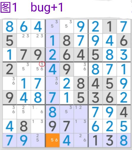 本单元要讨论的是基于致命结构来解题的另一种技巧,bug+1(双全值坟墓)。 ur结构是在两宫/两行/两列达到稳定构成的致命,而bug+1涉及到的是全盘所有的候选数。先说说bug+1的构造,全盘候选数只有一个三值格(三个候选数),剩下的单元格都是双值格,而且三值格中的某个数字a在三值格所在的行列宫都各出现3次,那么这个结构就是bug+1。(如果三值格有两个,两个三值格中分别有数字a跟数字b都各出现3
