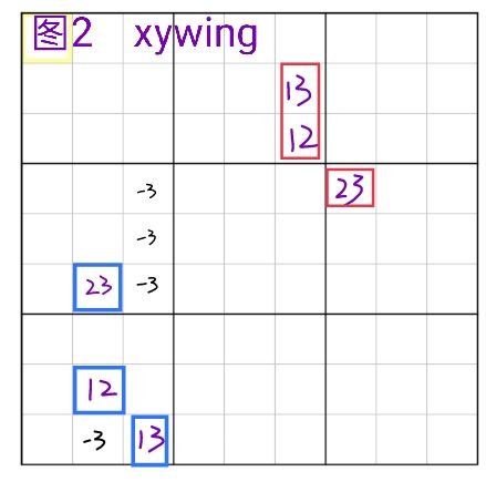 关于涉及到的各种名词详看①。 xywing是一种结构,结构形式为候选数分别只有ab/bc/ac的三个单元格,以ab为中心,bc跟ac分别跟ab有交集,删数格为bc跟ac的共同作用格的c,删数逻辑是当共同作用格c为真时,中心格ab无解。 图2中的蓝框为xywing的例子,r68c2,r9c3的三个格子构成了23/12/13的xywing(r8c2为中心格,r6c2与中心格同在c2,r9c3与中心格同