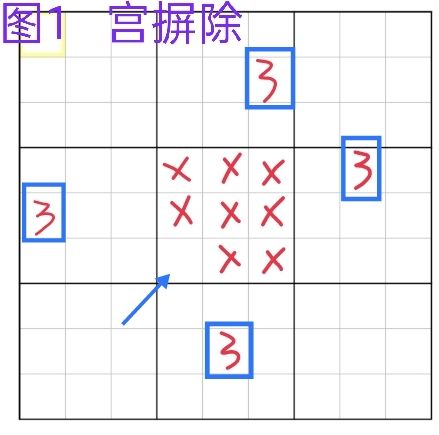 摒除法又分为行列摒除跟宫摒除,其中因为宫的视角比较集中,所以相对于行列摒除来说,宫摒除更容易被看到,图1就是一个宫摒除出数的例子。行列的视角更宽广,会相对于宫来说更不容易看到,图2为行列摒除出数的例子。区块跟摒除的例子,在之后的区块里再讲解。 ------------------------- 唯余法因为涉及到的数字比较多,所以相对于摒除来说,会更难观察到,图3为唯余出数的例子,唯余一般也只有在出