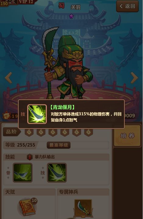 【蜀国简介】在我们对三国的认知里,蜀国最突出的就是猛将多。因此游戏中设定的阵营特色就是输出暴力,我们将该阵营的武将称为“暴力队”。暴力队的玩法非常“简单暴力”,阵容以强调伤害为主,凸显单秒、范围暴力输出的结合,这一点从该阵营几个主力输出将的技能效果上就可以看出。关羽的技能拥有极高的单体伤害系数,同战力情况下有机会直接斩杀对手,单秒能力相当恐怖。 赵云初始技能就有不俗的伤害,武将天赋特性使其