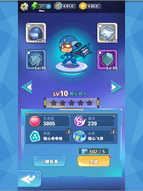 《开心超人》是一款创新的消除游戏。游戏通过三消来控制超人与怪物对战。看过原作的玩家都知道,作为主角的五位小超人,正义的使者,为了保护星星球,与邪恶势力斗智斗勇。今天小编就来给大家介绍一下,主角之一:粗心超人。 粗心超人,对应蓝色棋子,代表宽容,虽然记性不好,但确实一位武器专家的。游戏为粗心设计了两个技能。粗心奇奇枪:发射一枚燃烧弹,对敌人造成伤害,同时,对敌人进行三回合灼烧,造成持续伤害。粗心飞