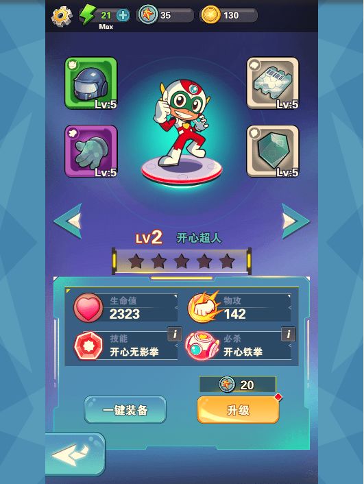 《开心超人》是一款创新的消除游戏。游戏通过三消来控制超人与怪物对战。看过原作的玩家都知道,作为主角的五位小超人,正义的使者,为了保护星星球,与邪恶势力斗智斗勇。今天小编就来给大家介绍一下,主角之一:开心超人。开心超人,对应红色棋子,代表勇气,是超人中力气最大的。游戏为开心设计了两个技能,开心无影拳:伤害翻倍,开心铁拳:清除3行棋子,并对敌人造成大量伤害。开心无影拳开心铁拳开心无影拳能够对敌