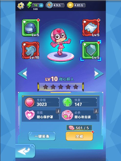 《开心超人》是一款创新的消除游戏。游戏通过三消来控制超人与怪物对战。看过原作的玩家都知道,作为主角的五位小超人,正义的使者,为了保护星星球,与邪恶势力斗智斗勇。今天小编就来给大家介绍一下,主角之一:甜心超人。 甜心超人,对应粉色棋子,代表善良。作为唯一一个女性超人,甜心的普通攻击,就可以回复生命。甜心超人拥有两个技能。甜心保护罩:回复生命的同时,释放保护罩减免伤害。甜心攻击波:激活所有棋盘内的粉