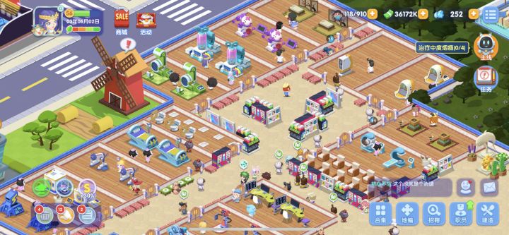 布局思路:导诊台放正中间,科室根据B站上找的治疗衔接关系和使用效率攻略进行排列,拼成四组,综合+药房+病房+手术室一组,消毒+神经+注射+整容一组,电击+智能+巫术+X光为一组,化验+针灸+CT+超声波为一组,将这四大组以顺时针顺序放在四个角落,用道路相连接,四通八达,整齐对称,剩下部分用水面覆盖,最后将需要摆装饰的地方点出草地。 想要称号,随手一赞谢谢啦! 友情码56HWIX