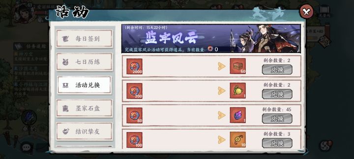 这次活动兑换,免费捞的玉璧只有5000个,大家先想好都换什么首先两个悟道果,400玉璧,必换两个红色古玩4000玉璧,45个遗迹石3600玉璧遗迹40个保底一红,这个大家自己看怎么选,我脸黑,准备选两个红古玩了————————————一个红古玩和25个遗迹石也有可行性,这个大家自己选择————————————三个独门10连300玉璧,可以换三个百家10连150玉璧,可以换,优先级排