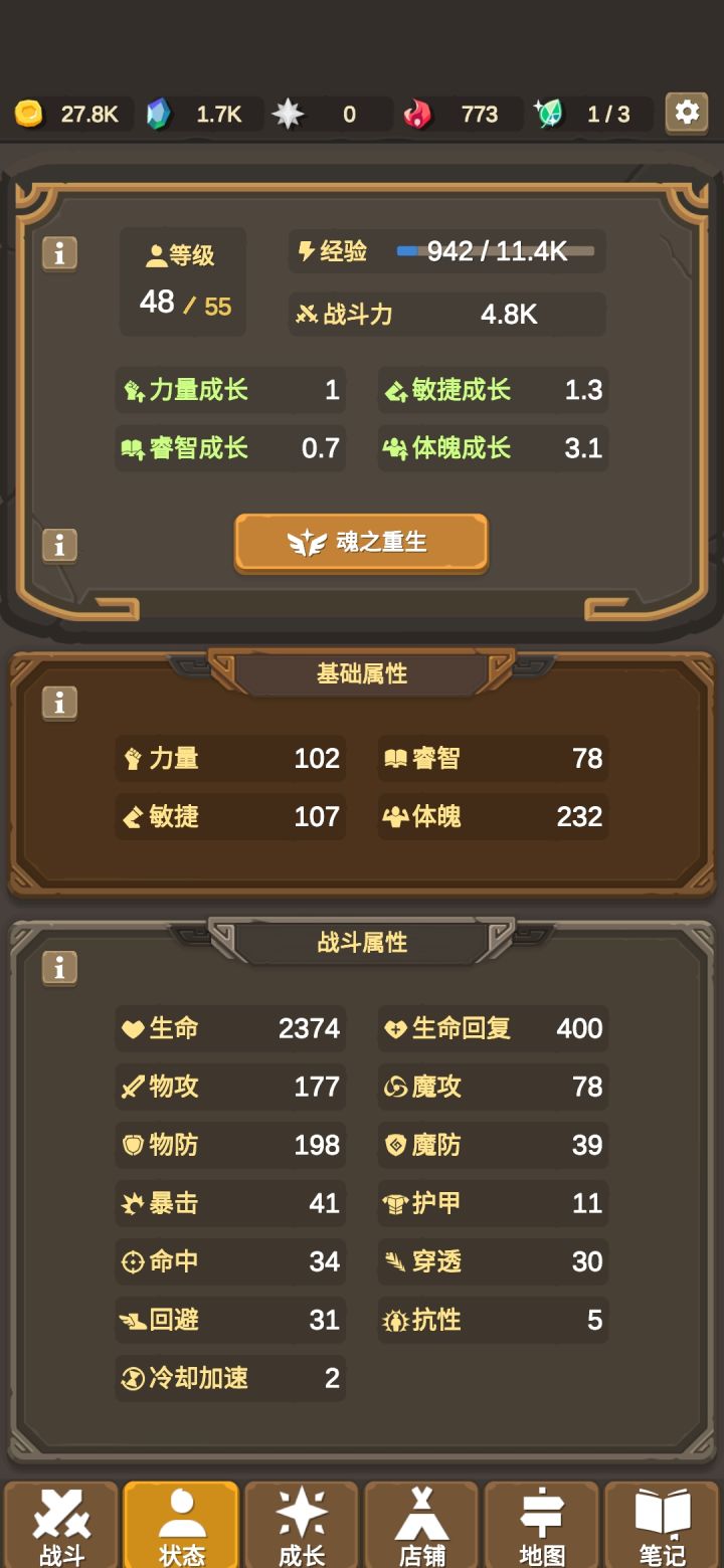 楼主玩了4days,没有用修改器,纯手打,113级通关。话不多说,直接上数据,敏捷点满,加点、装备如下图。兽人荒原boss战都不怕,主要是前面的小怪烦,点增加探索速率增大容错率。楼主前期(第一天)一直维持在55级,平均2min挂机重生,省级属性攒魂,之后逐渐提升等级上限,做到10-15min可以刷一次魂,打好基础,后期不愁。