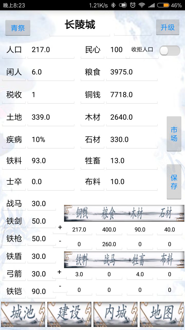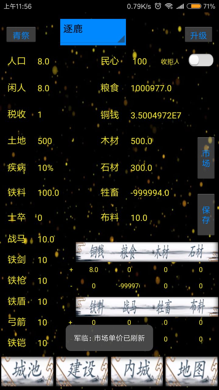 税率是一个难度调节器,税率是控制总人口,医馆,市场产出铜钱,最高可以改成四倍铜钱产量。只是调节如果修改超过四次民心60以下就基本可以重来了。游戏里还内置了一个后门。市场搞错了下个版本连带黑市一起改,本来应该是一分钟刷新结果十分钟去了。牧场是生产战马的,猎户是生产牲畜,牲畜售价很高的而且除了粮食铜钱外,所有资源一天生产四次。市场最后10点的交易额因为不明所以的bug不能使用,下个版本一起试试