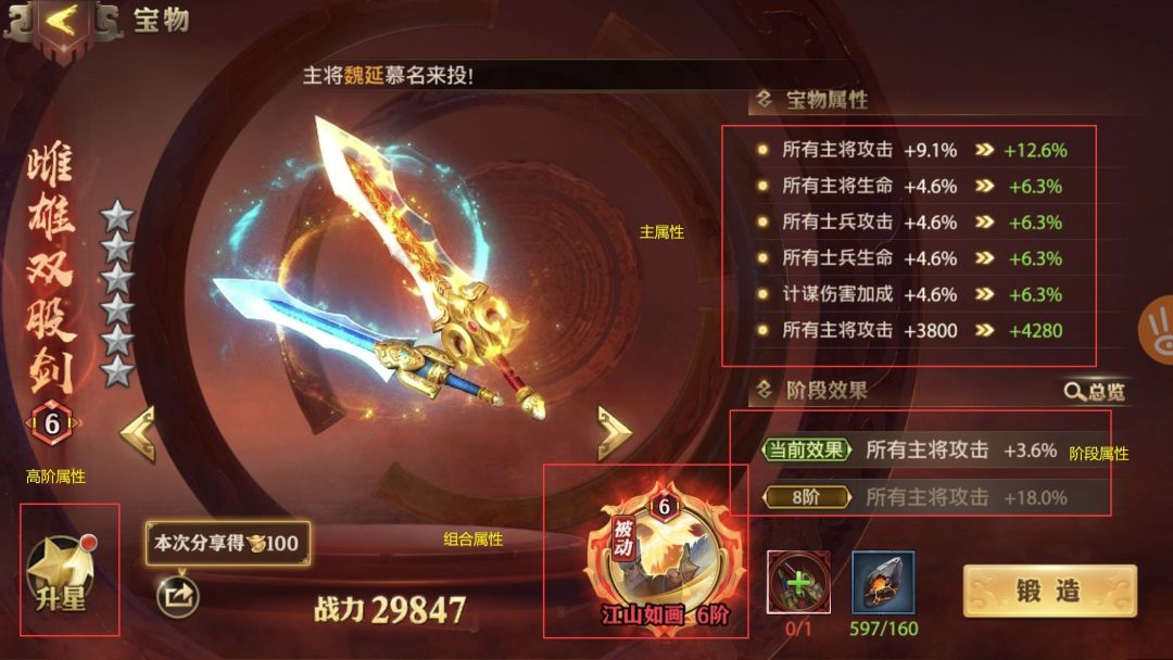 宝物技能强化推荐: 前言:大家都知道宝物技能激活后还可以通过锻造到更高阶段来提高其组合技能的阶段效果,今天就为大家盘点下一些宝物技能强化最高性价比的阶段。 【虎将天下】 基本属性:己方逐渐生命低于30%时,获得自身生命64%的护盾,每场战斗只能触发1次。 推荐阶段:8阶,额外提高目标主将30%的总攻击,持续15秒。 推荐理由:残血触发护盾的同时又获得了攻击力提升,绝对是翻盘的好机会,尤其配合一些自