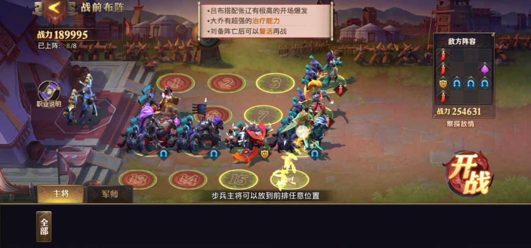 首先就是近战大部队站位靠后,延缓两军交战时间,为骑兵支援争取时间,骑兵单破一路带走对方治疗,廖化单挑险胜对方关莹屏,最后集合大部队带走对面,这是我目前测试最佳的91.70%