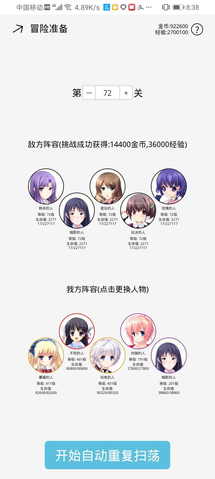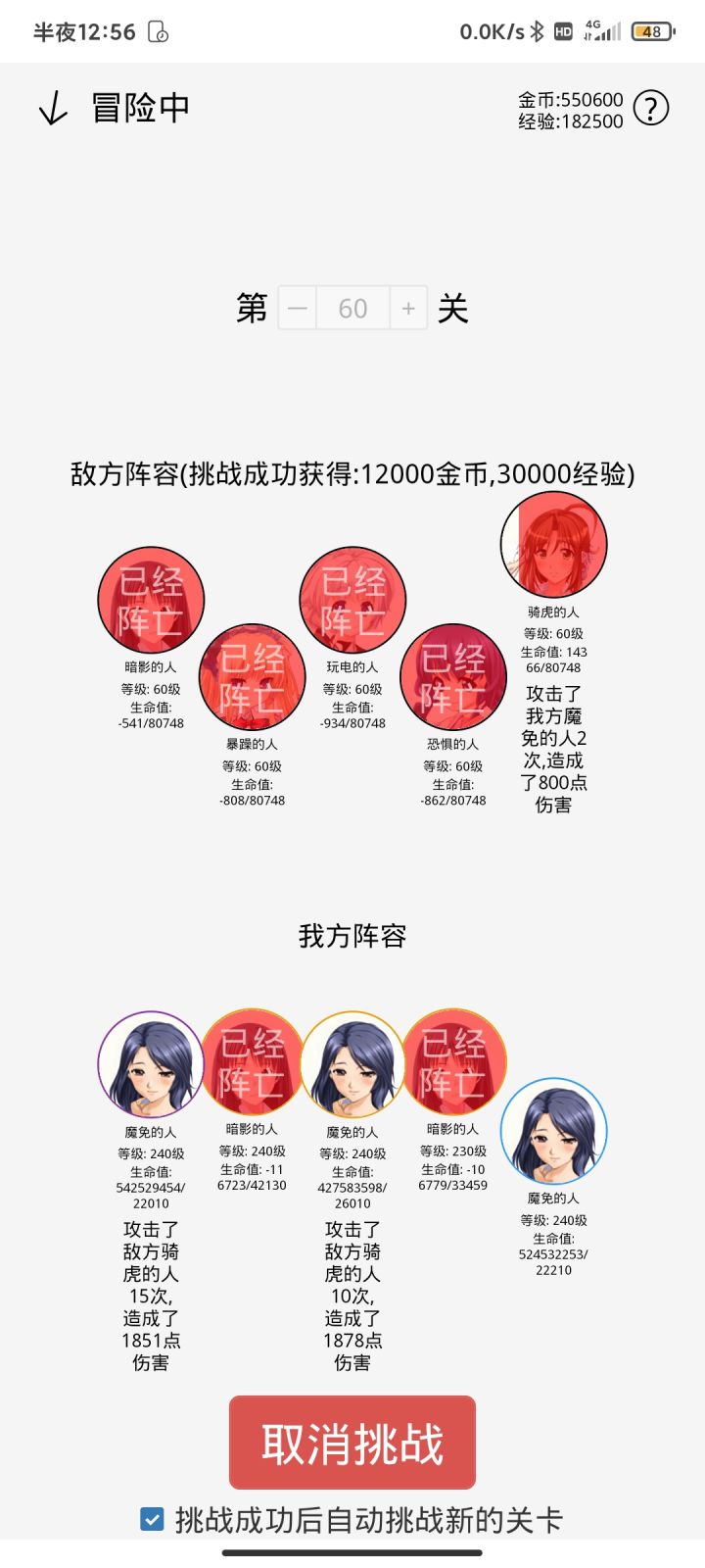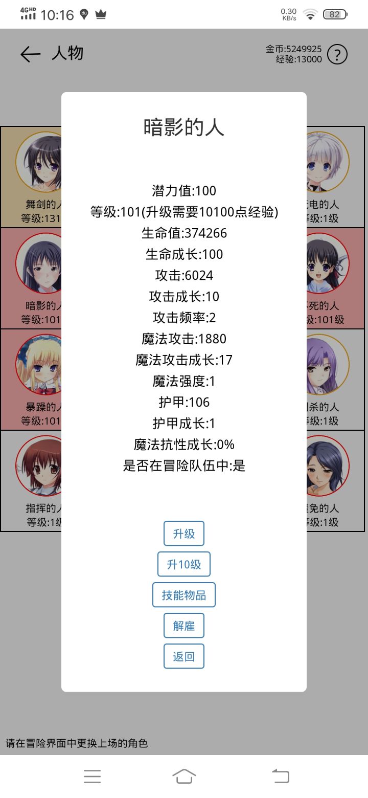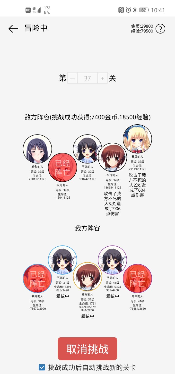 游戏很单调,貌似四个暗影的人和一个暴躁的人输出最高,四个暗影能一直相互叠血量,暴躁的人也能叠血量,然后伤害根据最大生命值造成伤害。普攻高层数很刮痧,在能秒的图刷经验。游戏很单调单纯挂机,前期还能玩一下,很快单纯挂机升级了,还有很多bug,剑舞的人没触发过秒杀技能,魔免的人用百分比普攻技能会动不了