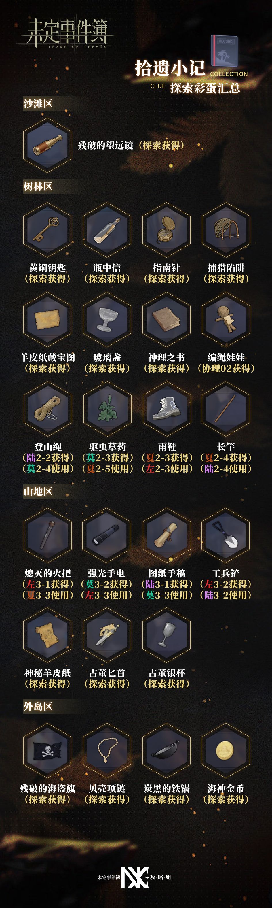【消失的黄金·彩蛋】更新完毕 tips:结合地图使用 登上岛之后我就是后悔,非常后悔,每天不是在迷路就是在迷路的路上,唯一的乐趣也只有看那四个野男人互相针对。 后来,我终于决定背着这几个男人自己愉快玩耍,结果路上却总是捡到一些奇奇怪怪的东西,比如残破的望远镜啊雨鞋啊什么的。 不过不管怎么说,还是先留着吧!没准什么时候就能派上用场了。 说不定我也可以变得像劳拉(古墓丽影的女主角)一样厉害呢!! 本次