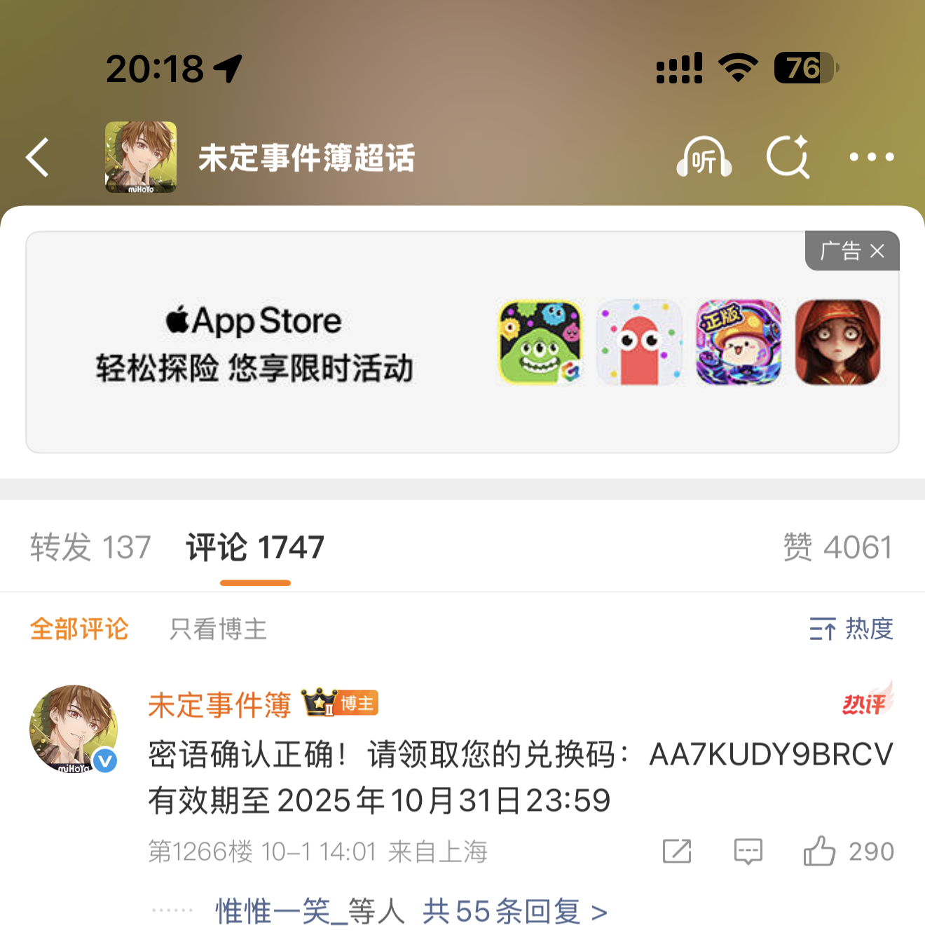 #未定事件簿 兑换码:gansuhuanyingni 2月20号凌晨4点过期,别忘了兑换哦
