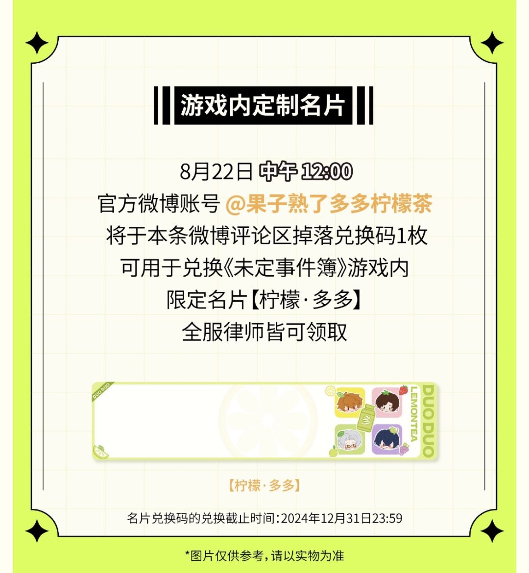 🎁兑换码: QSPZ72WD9LUZ 兑换奖励: 限定名片【柠檬·多多】 兑换方式: 安卓用户可在游戏内左上角【个人中心】-【设置】-【兑换码】处进行兑换 iOS用户可前往游戏官方网站,登录账号后,选择主页菜单栏中的【礼包码兑换】处进行兑换 兑换时间:截止2024年12月31日23:59 #未定事件簿