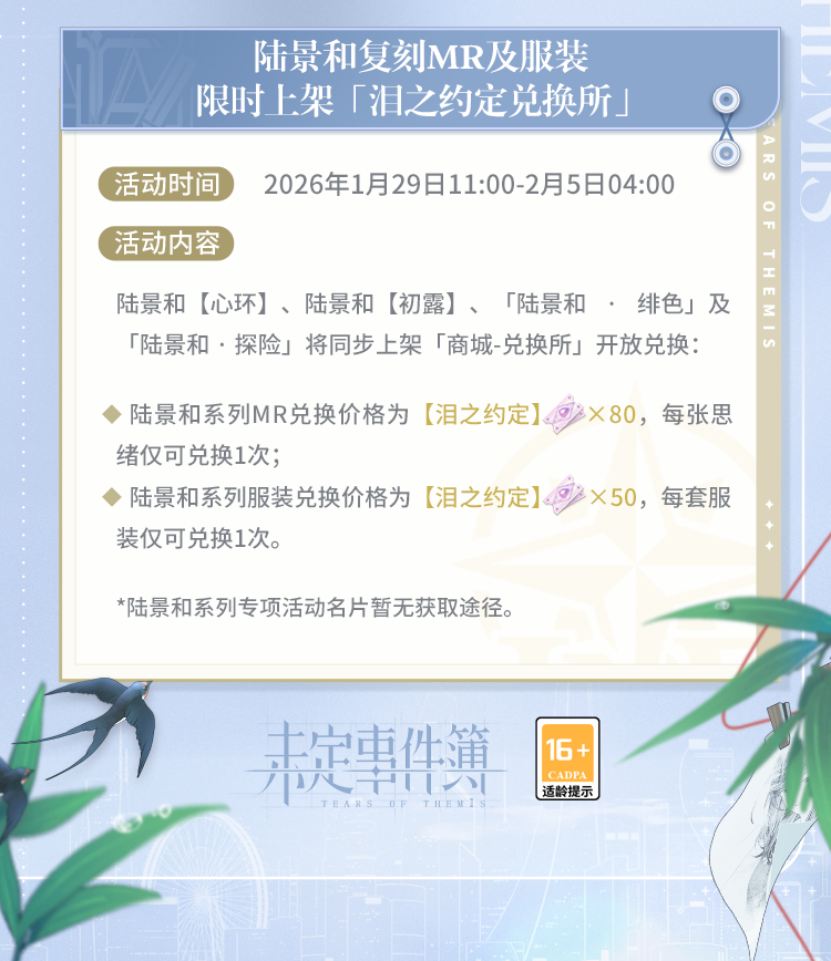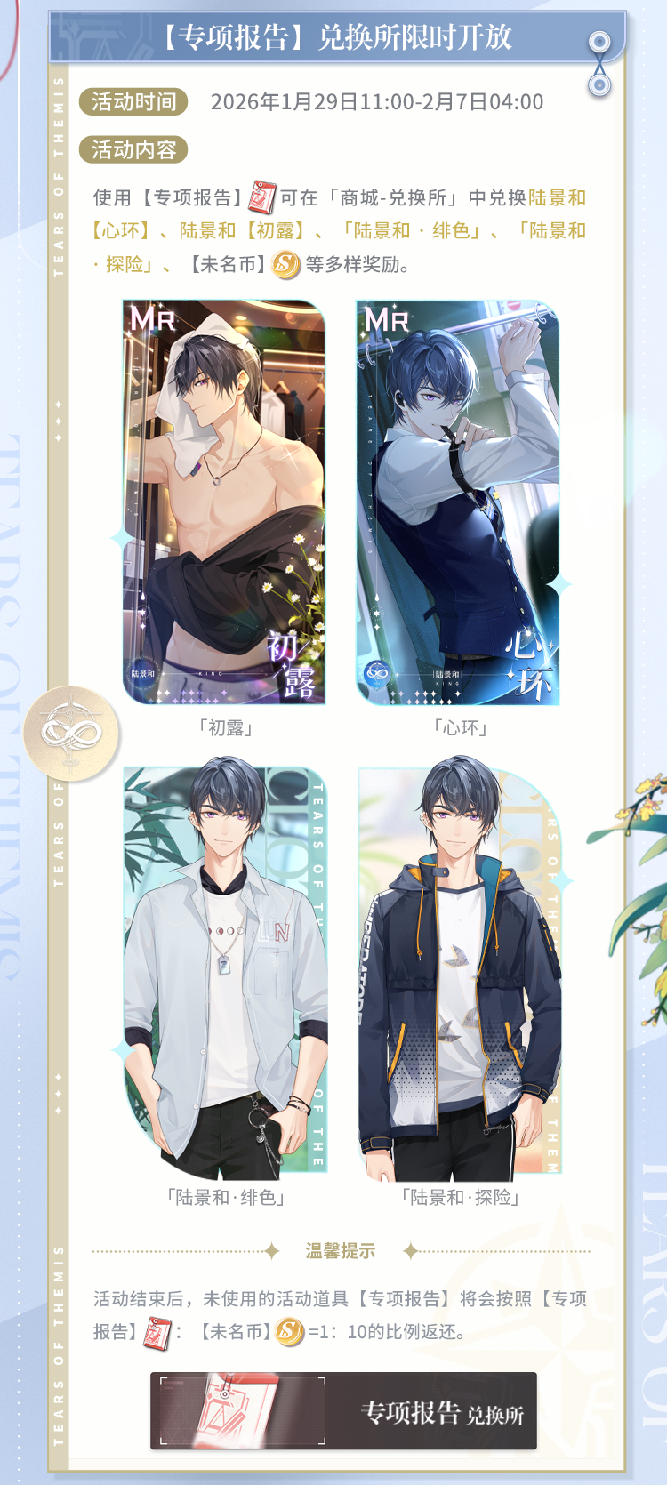 完成专项咨询,领取丰富奖励。2026年1月29日11:00,「专项咨询」陆景和系列限时复刻活动开放!✨「专项咨询」限时活动▶活动时间:2026年1月29日11:00-2月5日04:00「专项咨询」陆景和系列限时复刻活动开放,陆景和【心环】、陆景和【初露】、「陆景和 · 绯色」、「陆景和 · 探险」复刻开启。活动期间完成待办清单还可获得【未名晶片】、【专项报告】等多样奖励