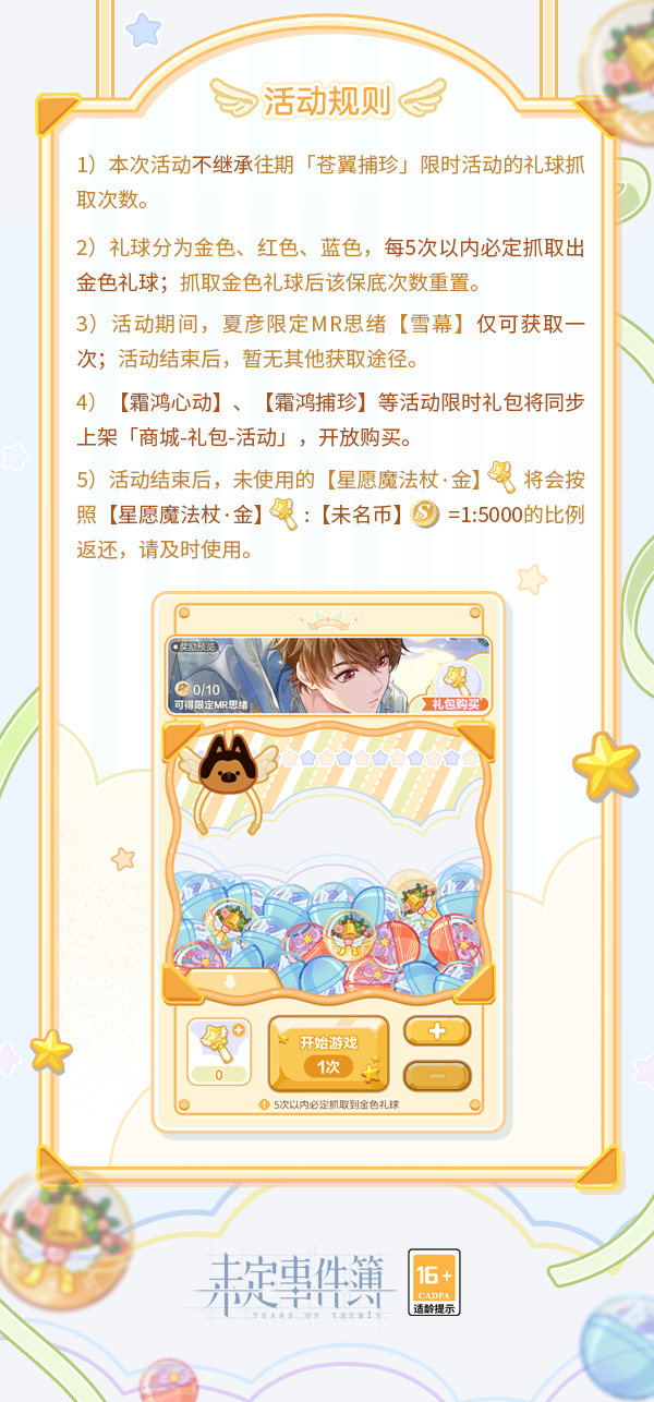 暮雪融于暖阳,童话降临为真。2026年1月29日11:00,「霜鸿捕珍」活动限时复刻!✨「霜鸿捕珍」活动限时复刻▶活动时间:2026年1月29日11:00-2月5日04:00活动期间,律师可通过购买活动限时礼包或消耗【未名晶片】获得的【星愿魔法杖·金】抓取各色礼球。每个礼球将在抓取后自动转化为【女神之泪】、【未名晶片】、升级素材道具等随机奖励;累计抓取10个金色礼球即可获取夏彦限定MR思绪