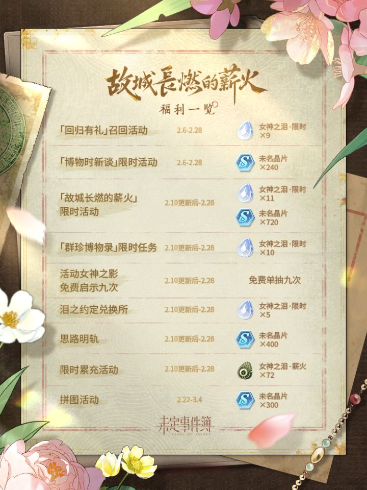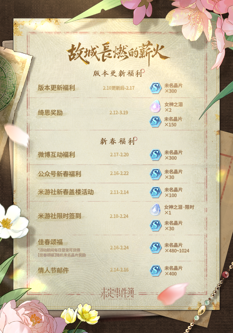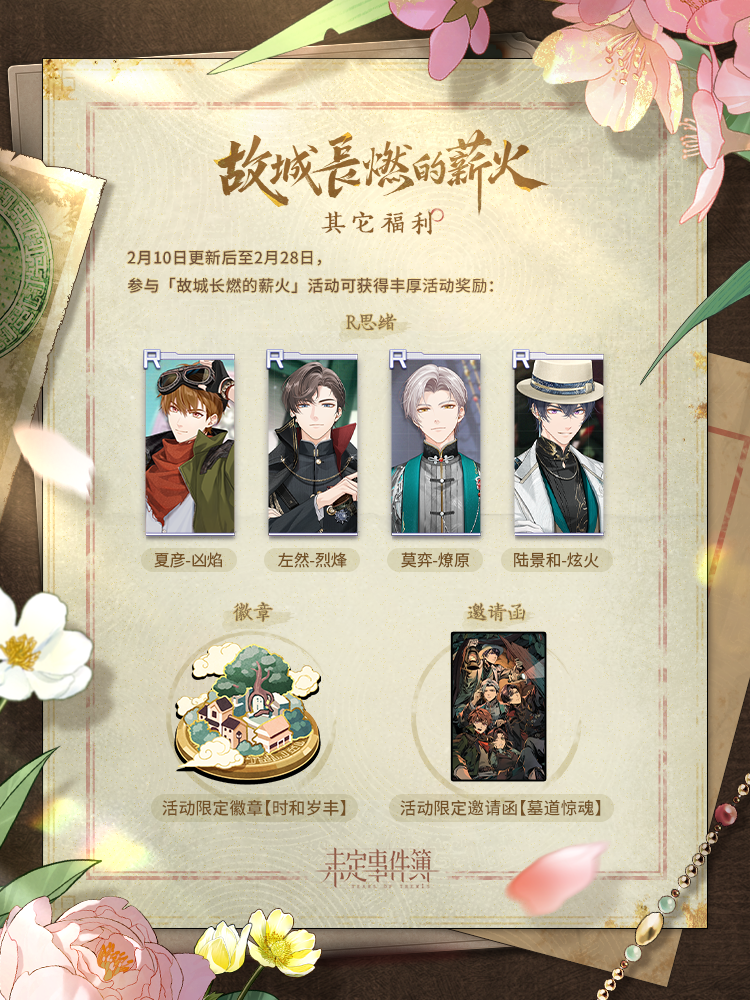 韬光如炬,燃此薪火。 ✨2月10日更新后,大型新春活动「故城长燃的薪火」正式上线! 叹隙中驹,长日无尽。 石中火,星点燃峥嵘岁月; 梦中身,醒来盼风清日和。 故事有声,群珍入画。 夜终尽,薪火长燃破晓时; 长相守,共迎黎明又一春。 ※《未定事件簿》大型新春活动「故城长燃的薪火」活动PV将于2月6日公开,敬请期待。