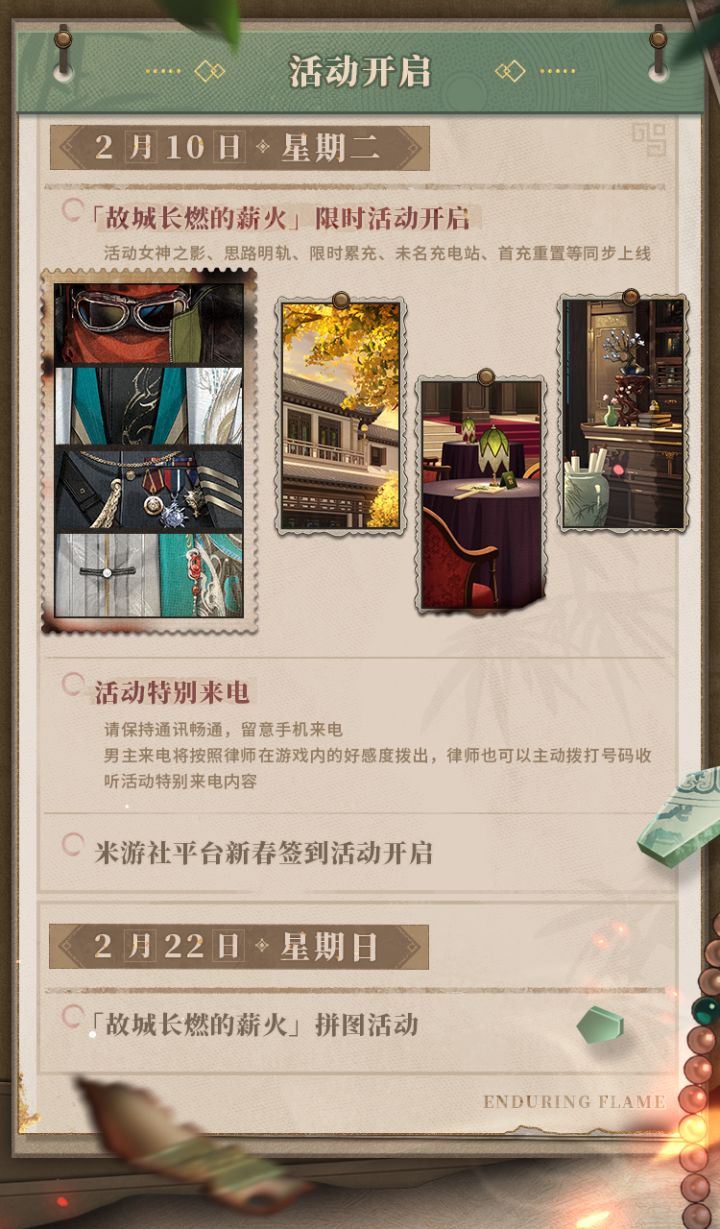 ✨2月10日更新后,大型新春活动「故城长燃的薪火」正式上线! -全新活动玩法,共解珍宝谜题 -参与限时活动,可获得活动限定邀请函【墓道惊魂】 -夏彦R思绪【凶焰】、左然R思绪【烈烽】、莫弈R思绪【燎原】、陆景和R思绪【炫火】即将开放获取 -【薪火主题】服装及背景即将上架外观商店 ※更多奖励内容详见后续官方公告
