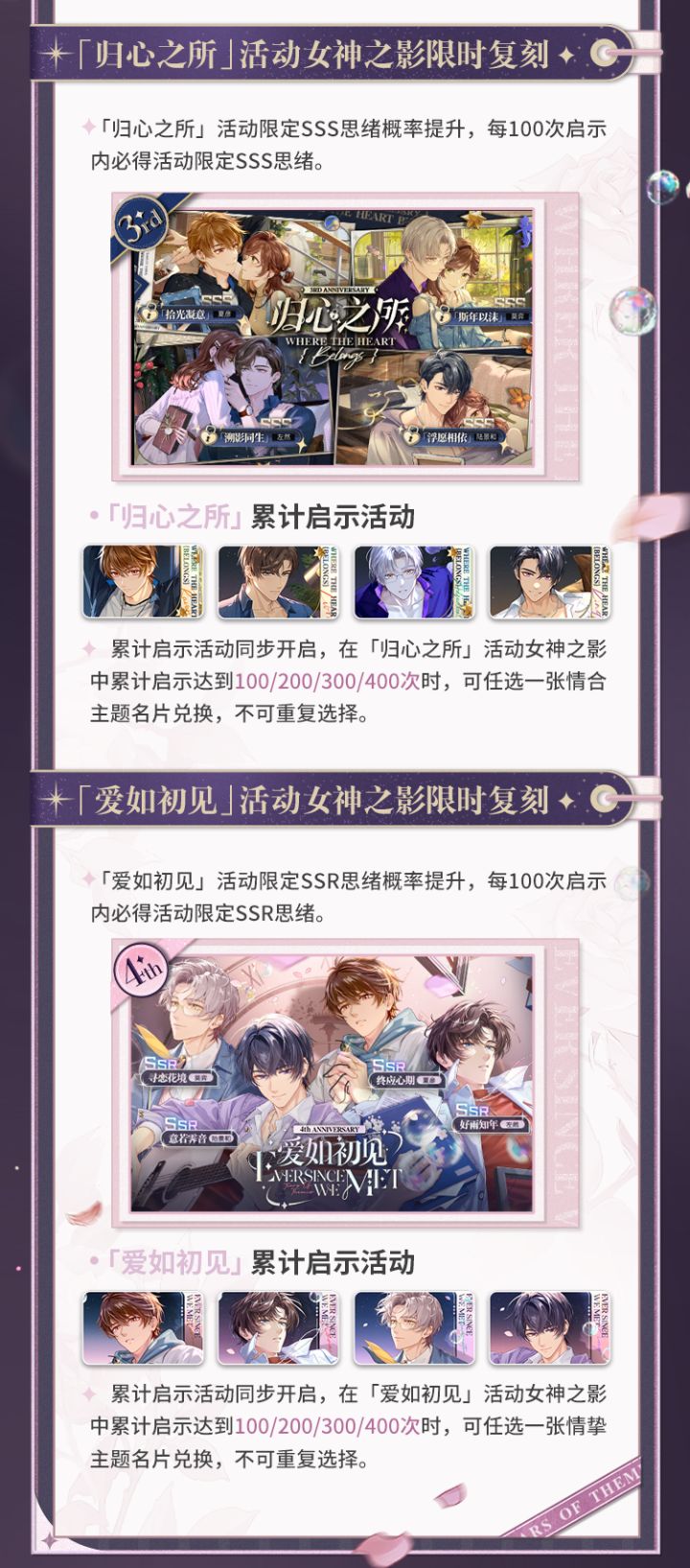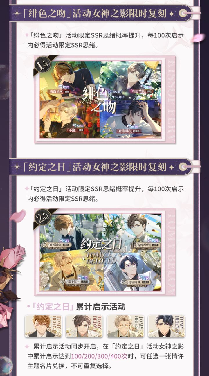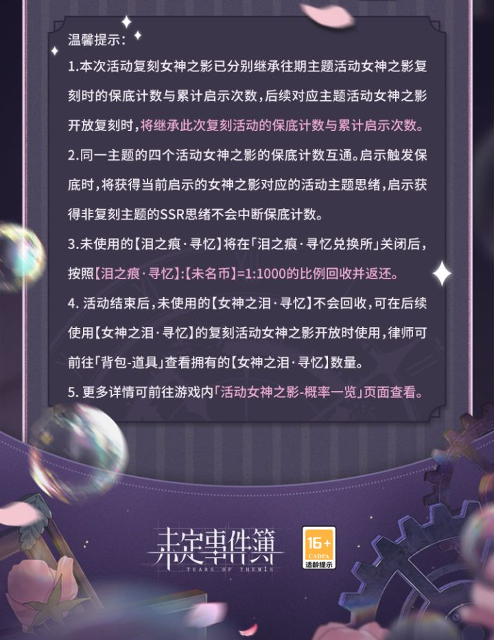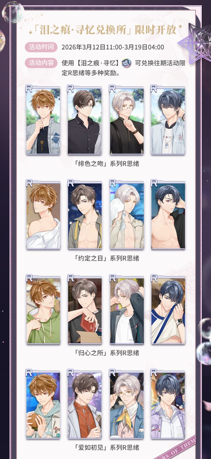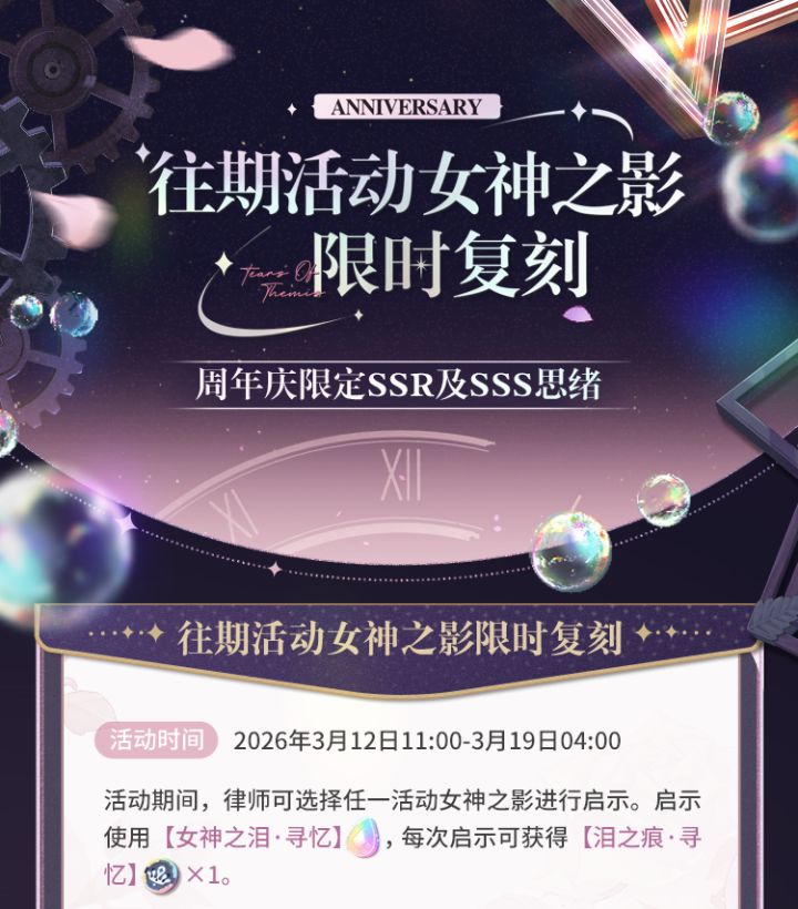 2026年3月12日起,「绯色之吻」、「约定之日」、「归心之所」及「爱如初见」活动女神之影将开启限时复刻!✨往期活动女神之影限时复刻▶活动时间:2026年3月12日11:00-3月19日04:00活动期间,律师可在复刻女神之影界面使用【女神之泪·寻忆】进行启示,每次启示可获得【泪之痕·寻忆】×1一、「绯色之吻」活动女神之影限时复刻活动期间,「绯色之吻」活动限定SSR思绪概率提升,每100