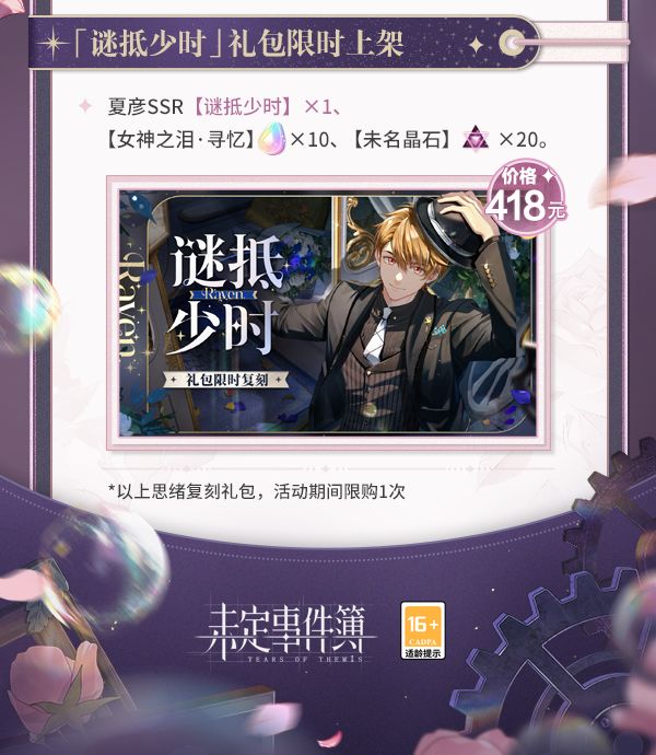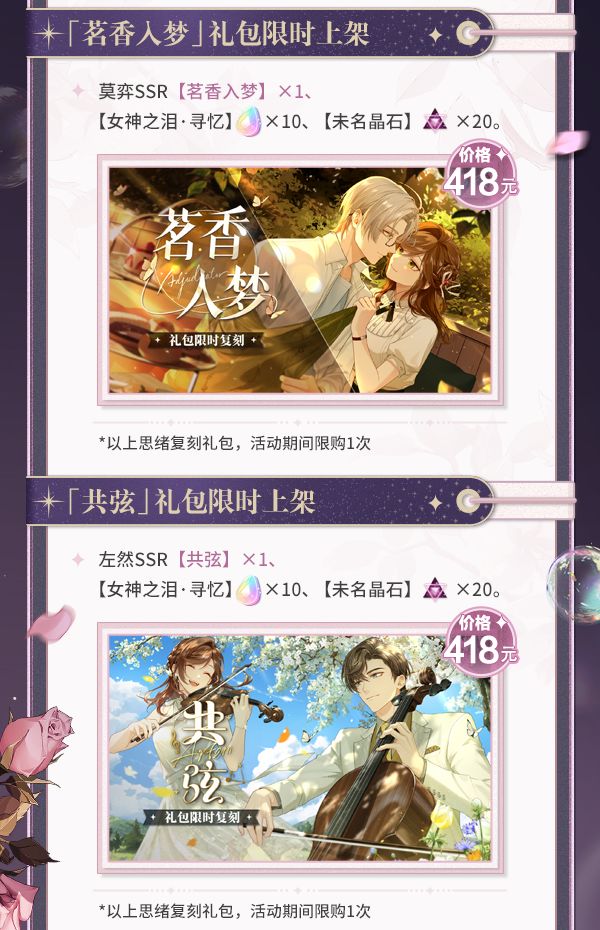 2026年3月12日起,「茗香入梦」、「共弦」、「谜抵少时」限时复刻即将开启!活动期间,往期活动系列复刻礼包限时上架「商城-限时」,开放购买✨「茗香入梦」礼包限时上架▶活动时间:2026年3月12日11:00-3月19日04:00-礼包内容:莫弈SSR【茗香入梦】×1、【女神之泪·寻忆】×10及【未名晶石】×20-礼包价格:418元※活动期间限购1次✨「共弦」礼包限时上架▶活动时间