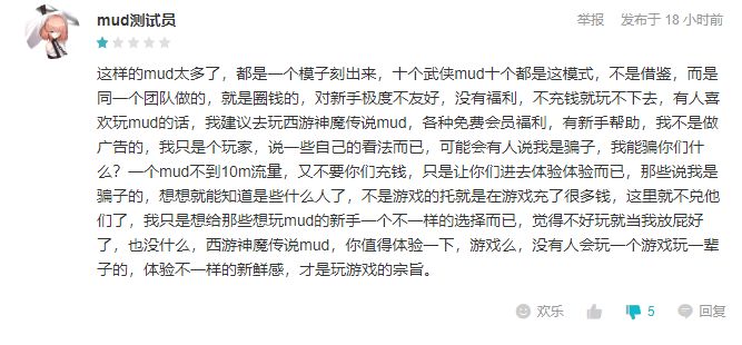 先对有收到这条评论的作者表示道歉,造成困扰表示歉意。同时声明,这个号不是我们的玩家,也不是开发者小号。是同行反着来黑我们的。具体的可以去看以下隔壁大唐修线录作者得意洋洋的回复。明眼人可以看出,届主大大用心良苦。不知道作为第三者的他为什么那么清楚这个mud测试员小号状况呢?还有为什么每次跟我对峙完都要把自己的回复删掉呢?心理可想而知。