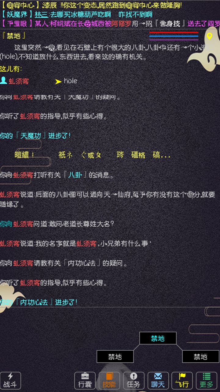 序本篇适合玩过mud的玩家, 零基础的朋友见谅.开局;1. 新人领礼物. 群里的<<新人发展指南>>等文中有提.2. 门派和种族选择. 建议选择自己喜欢的门派. 不过这里初期门派强弱差距还是比较大. 这里不做推荐, 实在想了解的群里问吧. 后面判师,出师,转世都可以换门派.属性:1. 先天属性都一样,不用选号. 客栈附近有天赋丹只能调整一次天赋. 取经后客栈附近有领奖励全天赋+22.