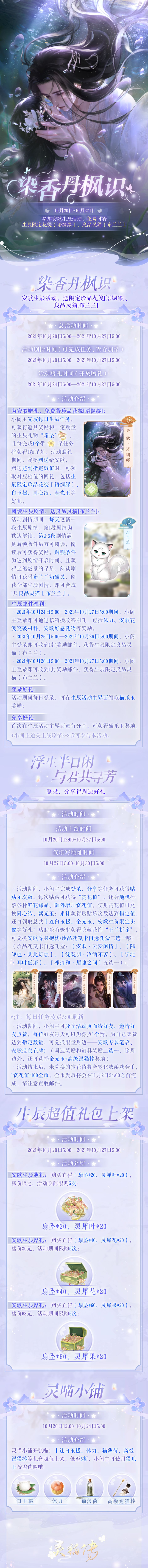 秋深月明,鲛人难觅,「染香丹枫识」安歌生辰特别活动将于10月20日5:00正式开启。 活动一:「染香丹枫识」 活动时间:10月20日5:00—10月27日5:00 ❤赠礼扇坠,免费得生辰限定珍品花笺[语绸缪]:活动期间,完成每日生辰任务后将获得一定数量的生辰赠礼【扇坠】;10月24日5:00—10月27日5:00期间,小阁主可将扇坠赠送给安歌,赠送达到指定数值,即可领取对应档位的回礼,其中包括生辰