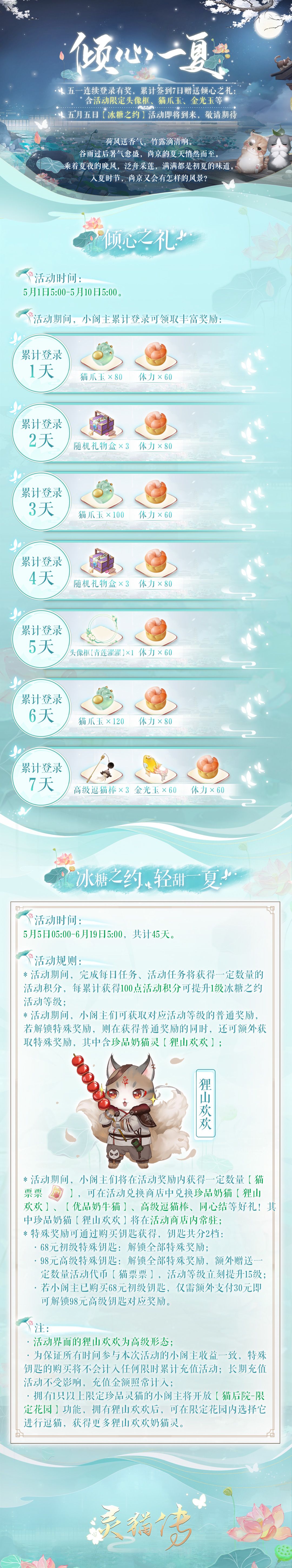 荷风送香气,竹露滴清响。谷雨过后暑气越盛,夏天的脚步越来越近。迎接小长假,「连续登录送礼」、「冰糖之约」活动即将到来,一起迎接尚京夏日吧❤。 活动一: 累计登录送倾心之礼 *活动时间:5月1日5:00-5月10日5:00 *活动期间,小阁主累计登录可领取丰富奖励,包括猫爪玉、体力、高级逗猫棒、以及“青莲濯濯”头像框等丰富好礼。 活动二:冰糖之约,轻甜一夏 *活动时间:5月5日05:00-6月19日