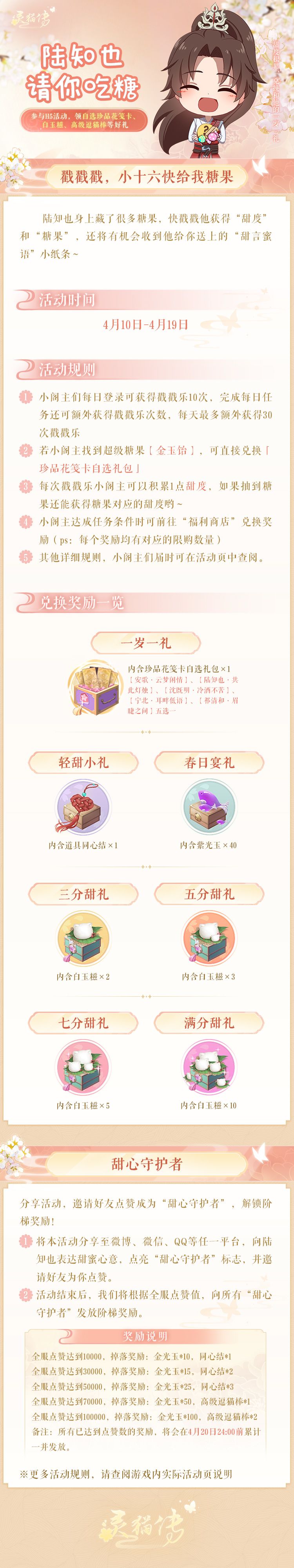 如何获得陆知也身上藏着的糖果?答案很简单,戳!戳!戳! 活动时间:4月10日—4月19日 ❤参与戳戳乐,兑换好礼:活动期间,小阁主可在游戏内完成登录、分享等任务获得戳戳乐次数,参与“陆知也请你吃糖”H5活动。每次戳陆知也可获得“甜度”,还将随机掉落各种糖果,将有机会兑换珍品花笺卡自选礼包(【安歌·云梦闲情】、【陆知也·共此灯烛】、【沈既明·冷酒不苦】、【宁北·耳畔低语】、【祁清和·眉睫之间】五选一