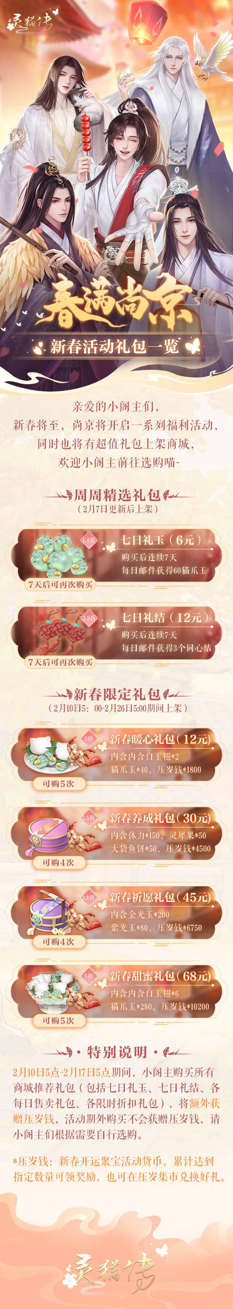 亲爱的小阁主们,新春将至,尚京将开启一系列福利活动,同时也将有超值礼包上架商城,欢迎小阁主前往选购喵~ ※周周精选礼包(2月7日更新后上架) 1.七日礼玉(6元):购买后连续7天,每日邮件获得60猫爪玉,7天后可再次购买 2.七日礼结(12元):购买后连续7天,每日邮件获得3个同心结,7天后可再次购买 新春限定礼包(2月10日5:00~2月26日5:00期间上架) ※新春限定礼包 1.新春暖心礼包