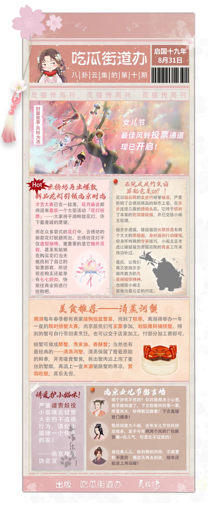 云绣坊爆款花灯为何供不应求?后院皮皮竹失窃背后又有怎样的隐情?女儿节最佳风铃究竟会花落谁家?点击本期吃瓜街道办,让我们一起走进尚京喵~————往期回顾————————————♥大小姐们都在这♥官网:https://cat.dailygn.com/?from_source=tap官方微博:@灵猫传B站官方账号:灵猫传抖音官方账号:灵猫传和TA的铲屎官们(抖音号:lingmaozhua