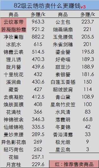 暂时不玩啦,先停更~思路写出来了,有详细的表,大家可以按照思路自己算哦~题目:卖什么更赚钱?答案:看表,从上往下,排的越前,赚的越多。推荐售卖方案和思路在表后面。79级推荐售卖方案:云纹革带+若凝脂粉霜,按1:2卖。比如卖2革带4若凝。67级推荐售卖方案:把 冰肌水 换成 净妆膏脂,其他不变61级推荐售卖方案:云纹革带+冰肌水,按1:2卖。比如卖2革带4冰肌水。如果配方材